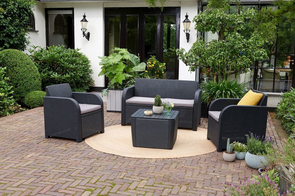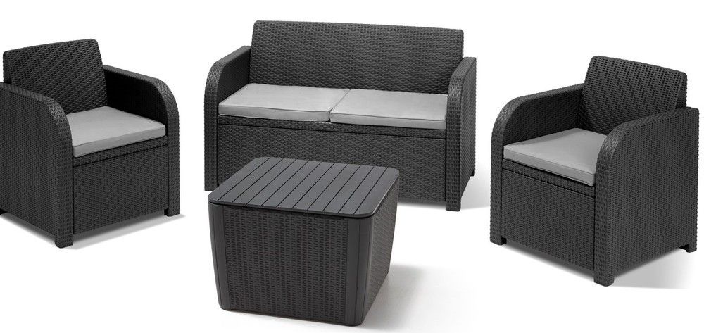 Sedacia súprava nielen na záhradu, ale aj do interiérov. Vyrobená z lisovaného plastu v imitácii umelého ratanu, set je doplnený o pohodlné podušky. Veľká výhoda tohto materiálu je ľahká údržba, odolnosť a dlhá životnosť. Set sa skladá z dvoch kresielok, stolíka a sofa. Stolík slúži zároveň ako box a môžete do neho uskladniť napríklad podušky.