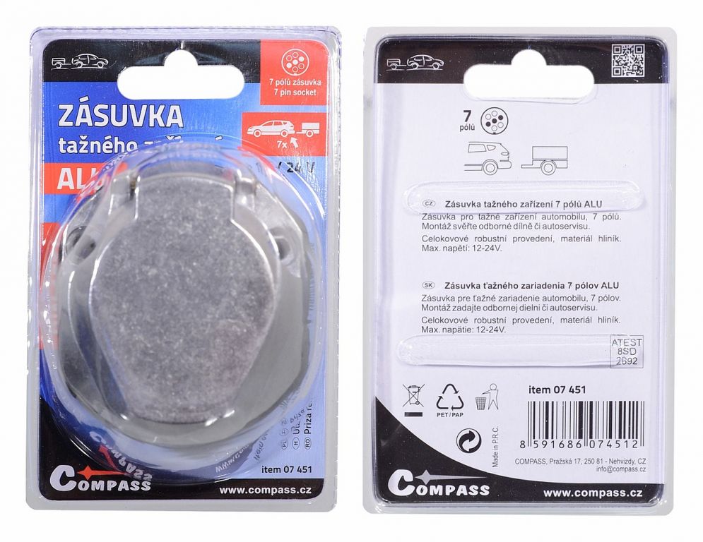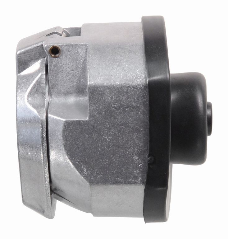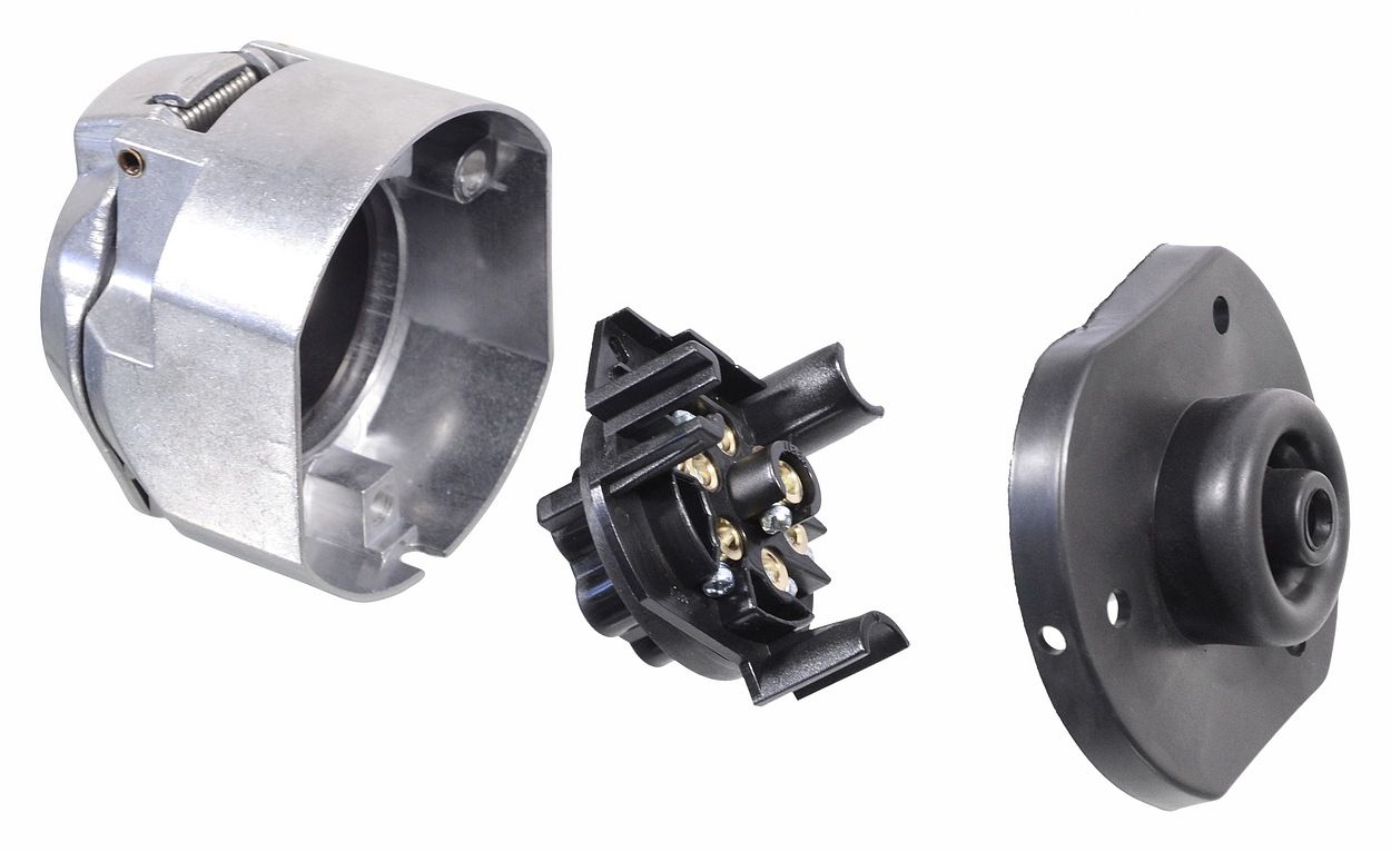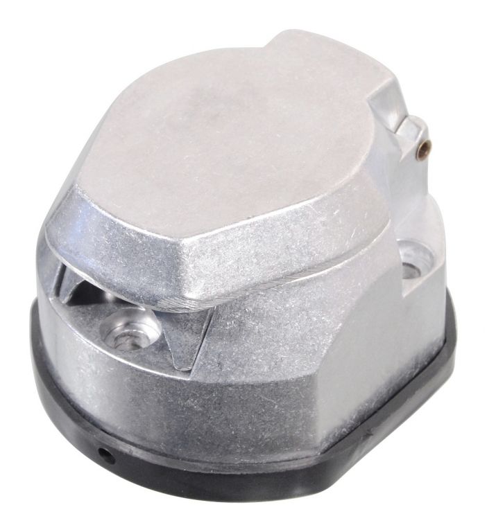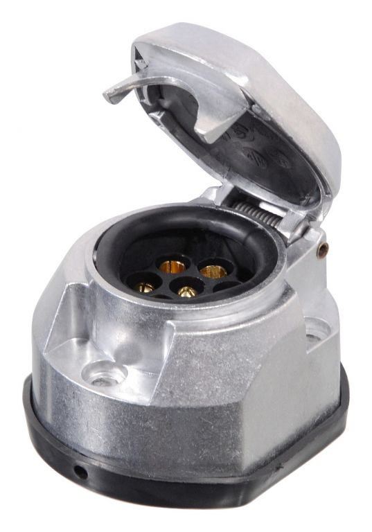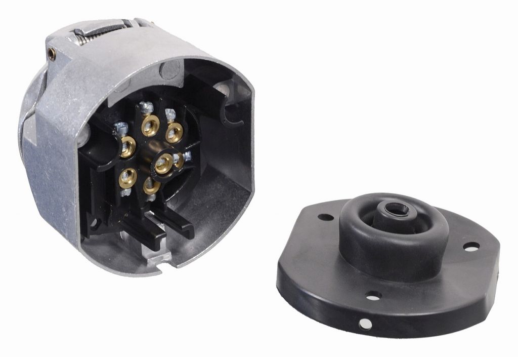 Celokovová ALU zásuvka pre ťažné zariadenie automobilu podľa normy DIN 1724, 7 pólov. Zásuvka je vybavená ako tesnením na montážnej strane, tak aj tesnením, priamo vo vnútri konektora, takže zaisťuje ešte dôkladnejšiu vodeodolnosť. Ďalej je vybavená kovovým krytom, ktorý sa automaticky (pružinou) uzatvára.