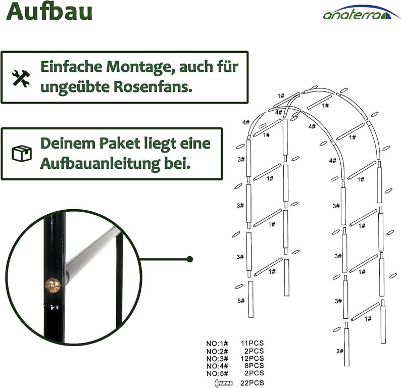 S naším dodávaným montážnym materiálom je inštalácia jednoduchá a rýchla. Konštrukcia sa upevňuje do hĺbky 20 cm do zeme a 13 mm priemer rúrok zaisťuje, že ružový oblúk zostane pevne na svojom mieste. Oblúk z práškovo lakovaného kovu poskytuje oporu všetkým popínajúcim rastlinám a efektne ich zvýrazní. Či už ako vstupná brána do malej zelenej oázy alebo ako oddeľovač medzi rôznymi časťami záhrady.