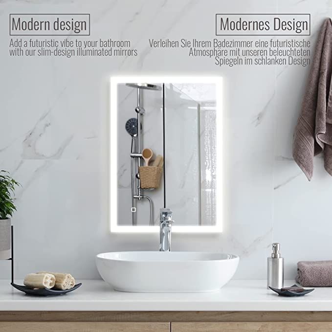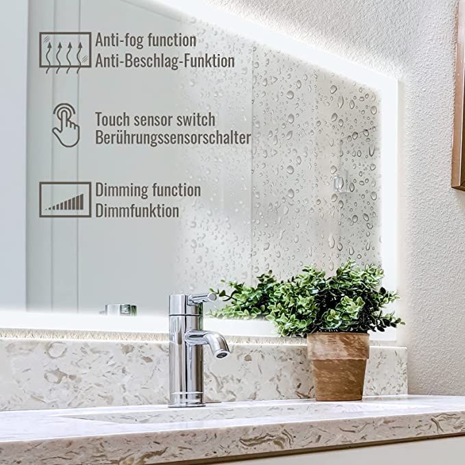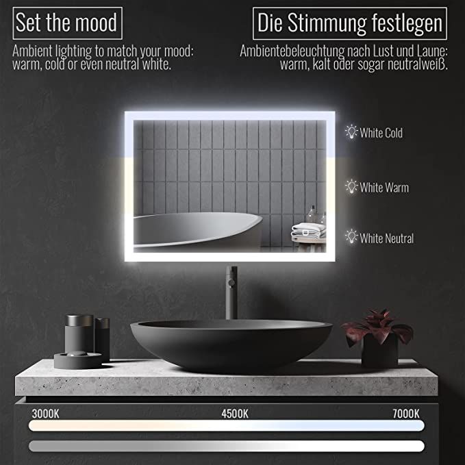 Vneste do svojej kúpeľne pokrokovú atmosféru vďaka našim osvetleným dizajnovým zrkadlám v tenkom prevedení. Toto kúpeľňové zrkadlo s osvetlením je vybavené funkciou proti zahmlievaniu, ktorá sa automaticky aktivuje pri zapnutí svetiel LED. Dotykové zrkadlo s funkciou stmievania poskytuje špeciálne ambientné osvetlenie podľa vašej nálady: teplé, studené alebo dokonca neutrálne biele LED. Zrkadlo je možné umiestniť buď horizontálne alebo vertikálne.