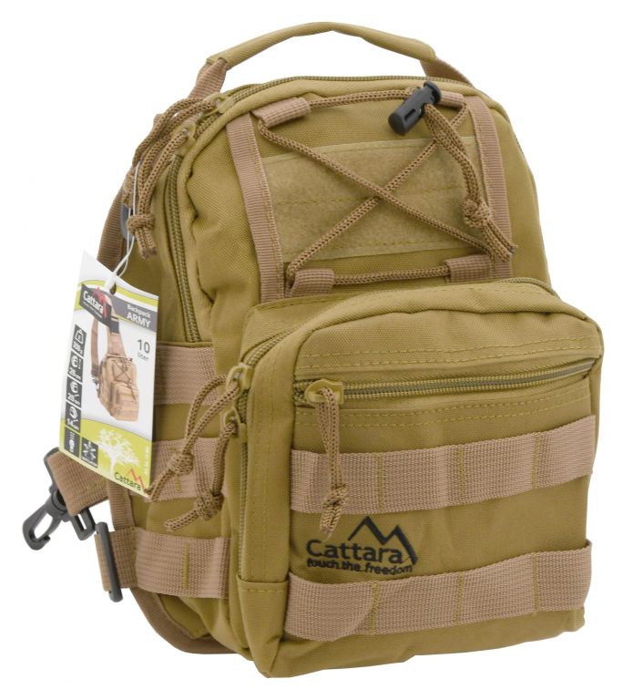 Praktický batoh cez rameno vojenského vzhľadu na túry do prírody. Predná strana batohu obsahuje Molle systém - to je systém, ktorý slúži na uchytenie ďalších doplnkov k výprave. Každé vrecko je zaistené pevným dvojcestným zipsom. Je vyrobený z polyesteru a má kapacitu 10 l.