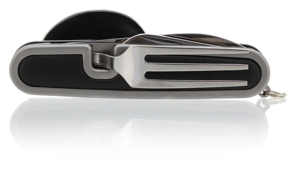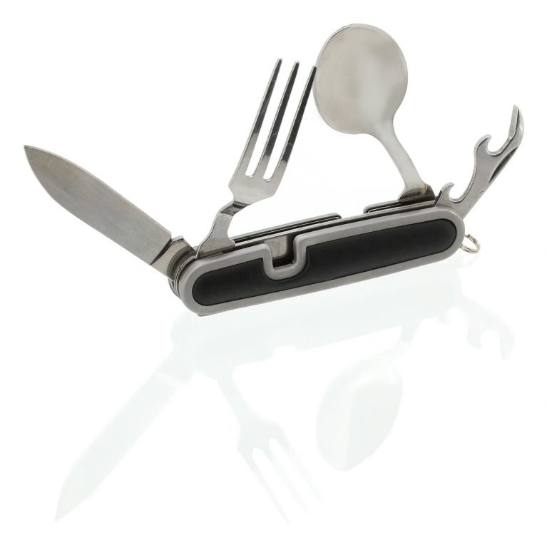 Prvá časť noža sa skladá z vidličky, otvárača na plechovky a viečka fliaš, druhá časť skrýva lyžicu a samotnú čepeľ noža.