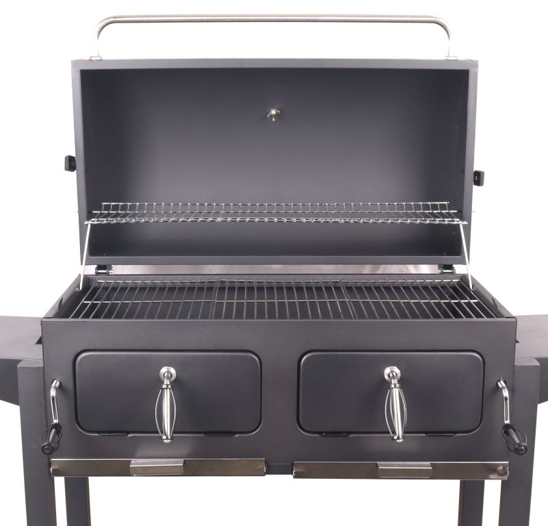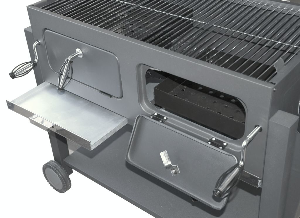 Vysoko stabilná konštrukcia z precízne opracovanej ocele vybavenej odolnou, hrubou čiernou farbou. Konštrukcia je doplnená 2x kolieskami uľahčujúcimi mobilitu grilu. Rám v spodnej časti slúži na ďalšie zvýšenie stability a rovnako ako odkladací priestor. Na bokoch sú umiestnené skladacie poličky na odkladanie rozličného vybavenia na grilovanie alebo odkladanie samotných pokrmov. Ovládacie kovové prvky a rukoväte majú dostatočné rozmery pre pohodlný úchop a zaisťujú ľahkú manipuláciu. Obojstranná oceľová regulácia ventilácie perfektne lícuje s konštrukciou. Vyklápacie veko je vo vrchnej časti doplnené teplomerom pre stálu kontrolu teplôt vo vnútri grilu. Pre samotnú tepelnú prípravu Vašich pochutín je gril vybavený robustným, trojdielnym roštom z ocele. Ďalej je grilovací priestor osadený odkladacím roštom na udržanie teploty už hotových pokrmov alebo na ich predhriatie. Ďalšou prednosťou grilu sú rošty na uhlie s nastaviteľnou výškou, grilovací priestor je tak možné regulovať pomocou mechanizmov na prednej strane podľa požiadaviek daných pokrmov. Dvierka na čelnej strane grilu významne uľahčujú dopĺňanie uhlia. Na uľahčenie čistenia sú potom určené zásuvky na popol v najspodnejšej časti grilovacieho priestoru.
