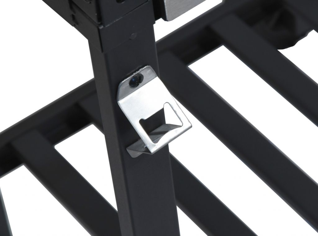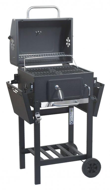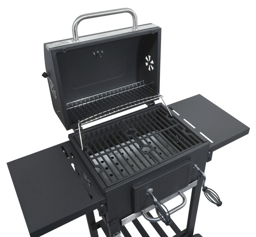 Vysoko stabilná konštrukcia z precízne opracovanej ocele je opatrená odolnou, hrubo čiernou farbou. Konštrukcia je doplnená 2x kolieskami uľahčujúcimi mobilitu grilu. Rám v spodnej časti slúži na ďalšie zvýšenie stability a rovnako ako odkladací priestor. Bočné strany sú doplnené sklápacími poličkami na odkladanie rozličného vybavenia na grilovanie, alebo samotných pokrmov. Ovládacie kovové prvky a rukoväte majú dostatočné rozmery pre pohodlný úchop a zaisťujú ľahkú manipuláciu. Obojstranná oceľová regulácia ventilácie perfektne lícuje s konštrukciou. Vyklápacie veko je vo vrchnej časti vybavené teplomerom pre stálu kontrolu teplôt vo vnútri grilu. Pre samotnú tepelnú prípravu Vašich pochutín je gril opatrený robustným, dvojdielnym, liatinovým roštom. Ďalej je grilovací priestor osadený odkladacím roštom na udržanie teploty už hotových pokrmov, alebo na ich predhriatie. Ďalšou prednosťou grilu je rošt na uhlie s nastaviteľnou výškou, grilovací priestor je tak možné regulovať pomocou mechanizmu na prednej strane, podľa požiadaviek daných pokrmov. Dvierka na čelnej strane grilu významne uľahčujú dopĺňanie uhlia. Na uľahčenie čistenia je potom určená zásuvka na popol v spodnej časti grilu.