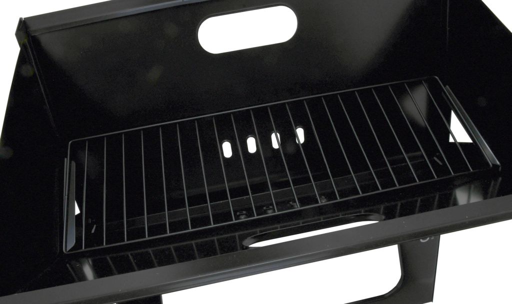 Konštrukcia je vyrobená z kvalitnej ocele s čiernym smaltovaným povrchom. Stabilitu zaisťuje krížová konštrukcia tela grilu. Rozmery grilu 43 x 28 x 37 cm. Na tepelnú prípravu pochutín je gril vybavený oceľovým roštom a plochou 42,5 x 26 cm vo výške 36,5 cm. Ventilácia na čelnej a zadnej strane konštrukcie zaistí plynulý prísun vzduchu. Pre ľahké prenášanie je možné gril jednoducho zložiť. Prepravné rozmery sú 46 x 44 x 3 cm.