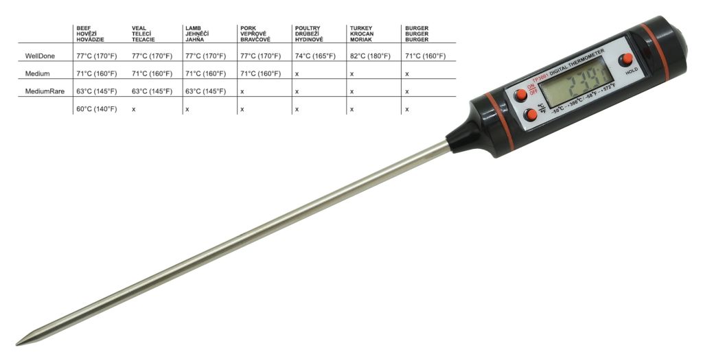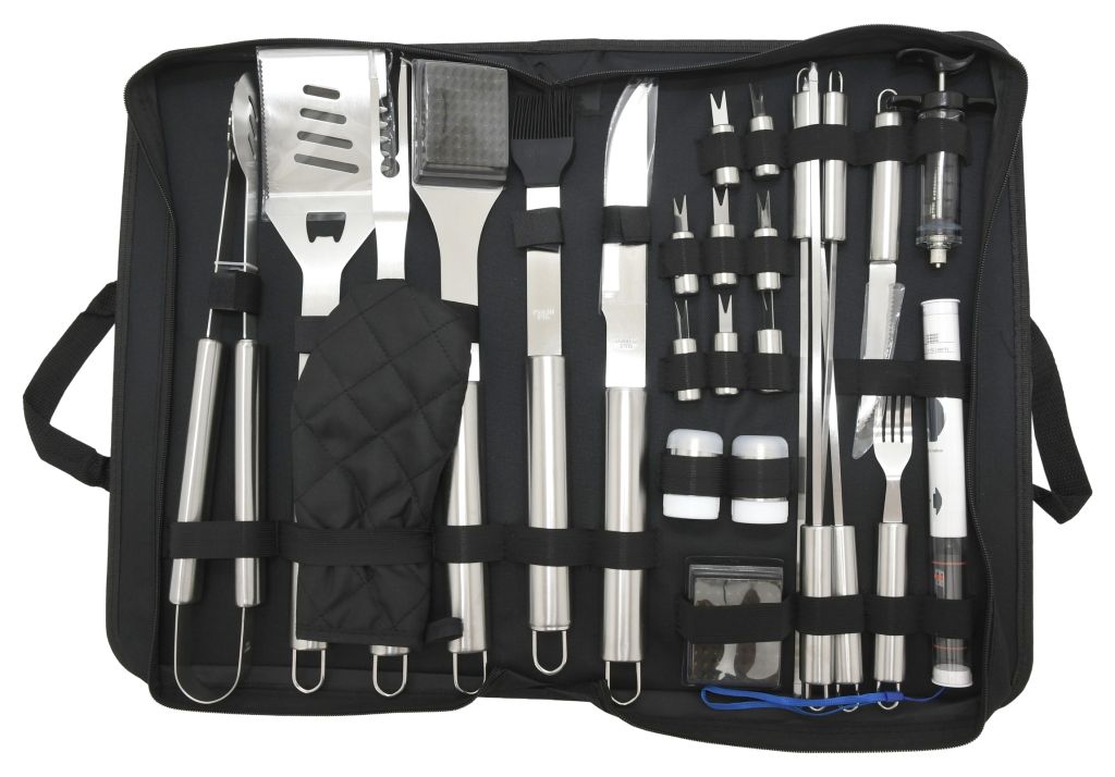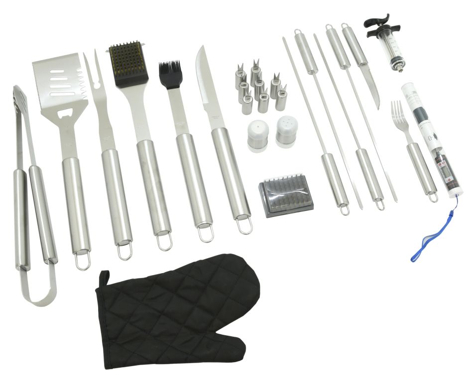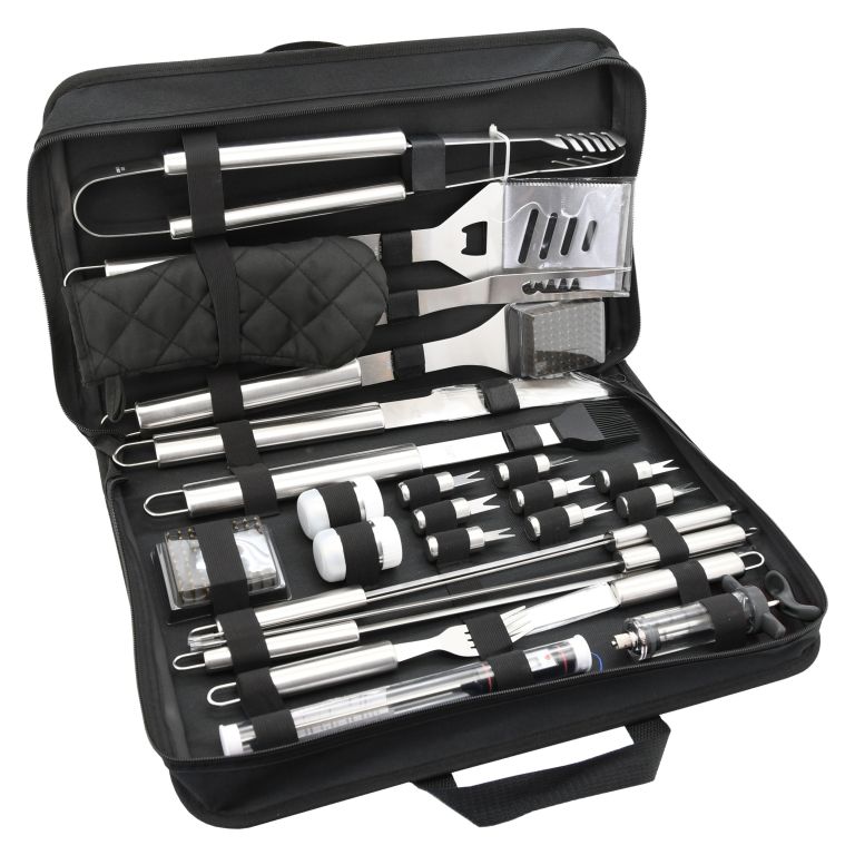 Sada obsahuje všetky nástroje na prípravu a konzumáciu najrôznejších pokrmov, ale aj následnú údržbu grilu. Všetky nástroje sú navyše kvalitne spracované z nerezovej ocele. Okrem iného je súčasťou sady aj injekcia pre aplikáciu marinády do mäsa a praktický teplomer s nerezovou sondou na overenie prevedenia mäsa s rozsahom merania -50 - 300 °C. O napájanie teplomera sa stará 1x batéria LR44 (1,5V). Sada je úhľadne umiestnená v textilnej taške a hodí sa pre tých najnáročnejších vyznávačov dobrého jedla. Výpočet jednotlivých nástrojov ocení ktokoľvek. Sada je primárne určená na využitie doma na záhrade, avšak užitočná je aj na cestách.