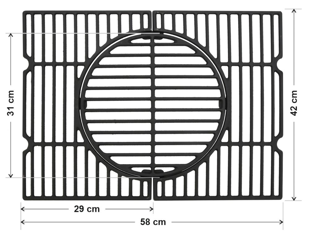 Liatinový rošt s trojdielnou konštrukciou s celkovými rozmermi 58 x 42 cm so stredovou časťou s priemerom 31 cm. Náhradný liatinový rošt je vhodný priamo pre gril Cattara ROYAL 13040, ale aj iné grily zodpovedajúcich rozmerov.