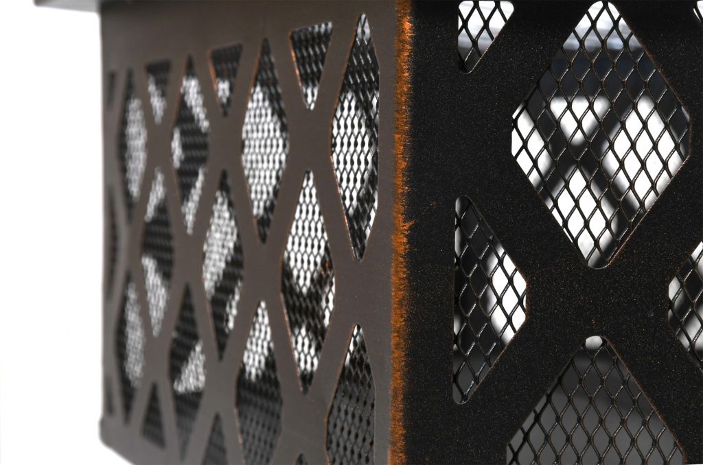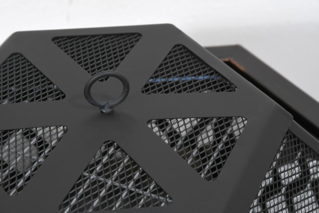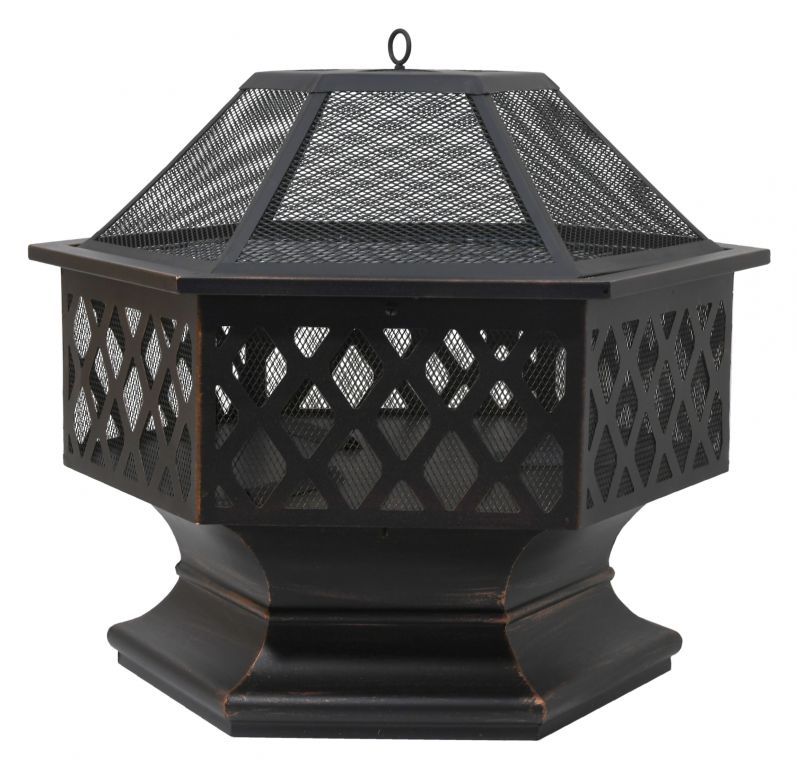 Prenosné ohnisko na drevo HEXAGON so šesťuholníkovou konštrukciou vhodné na terasy a záhrady. Konštrukcia ohniska je vyrobená z kvalitnej ocele s vysokoteplotným čiernym/medeným náterom s patinou. Na grilovanie je ohnisko vybavené oceľovým roštom s rozmermi 61 x 53 cm. Špeciálne tvarovaný poklop s pletivom poslúži ako ochrana pred iskrami, čo výrazne zvyšuje bezpečnosť a pohodlie. Ohnisko je navyše vybavené pevným podstavcom, jeho umiestnenie tak ponúka skrášlenie priestoru.
