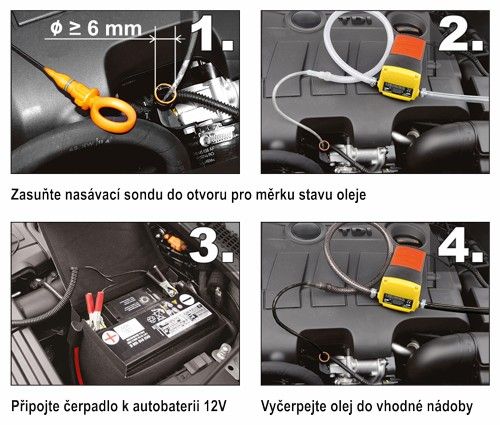 Napájanie pomocou svoriek, ideálne na pripojenie na autobatériu 12 V. Vhodné pre jednoduchú výmenu motorového oleja. Nie je nutné hľadať vypúšťaciu skrutku oleja, stačí len zasunúť nasávaciu sondu do otvoru pre mierku stavu oleja (až do vnútorného priemeru 6 mm) a olej vysať do pripravenej nádoby.