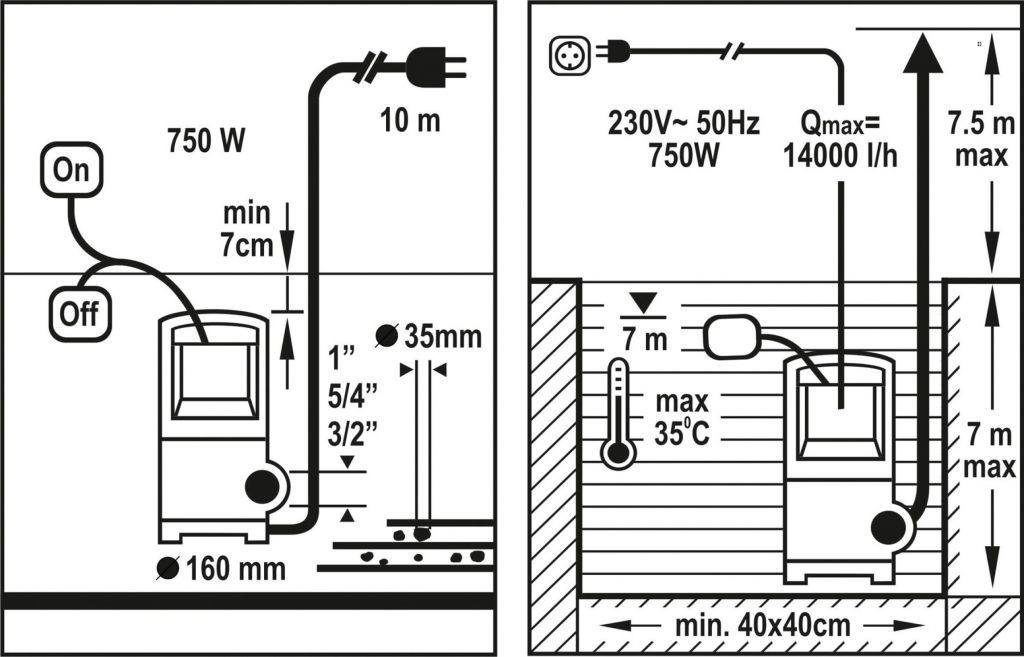 Telo čerpadla je vyrobené z vysoko odolného plastu, ďalej je vybavené plavákovým spínačom, ktorý zabraňuje prevádzke čerpadla "na sucho". Pre pripojenie do siete je čerpadlo vybavené káblom dĺžky 10 m.