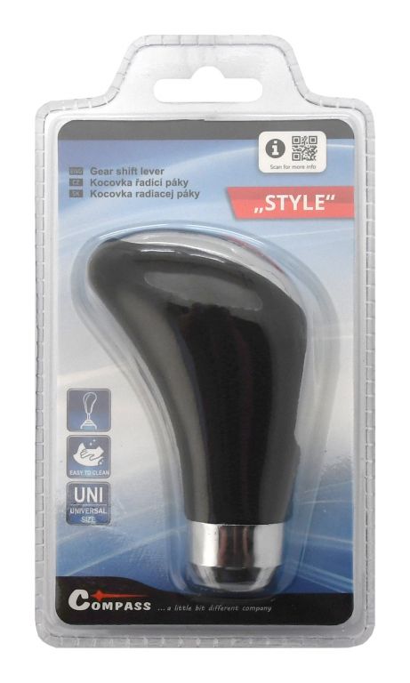 Univerzálna koncovka pre bežné radiacej páky (priemer tyče 7 - 15 mm). Prevedenie tela v kombinácii kovu čiernej farby a chrómu, doplnené o imitáciu kože.