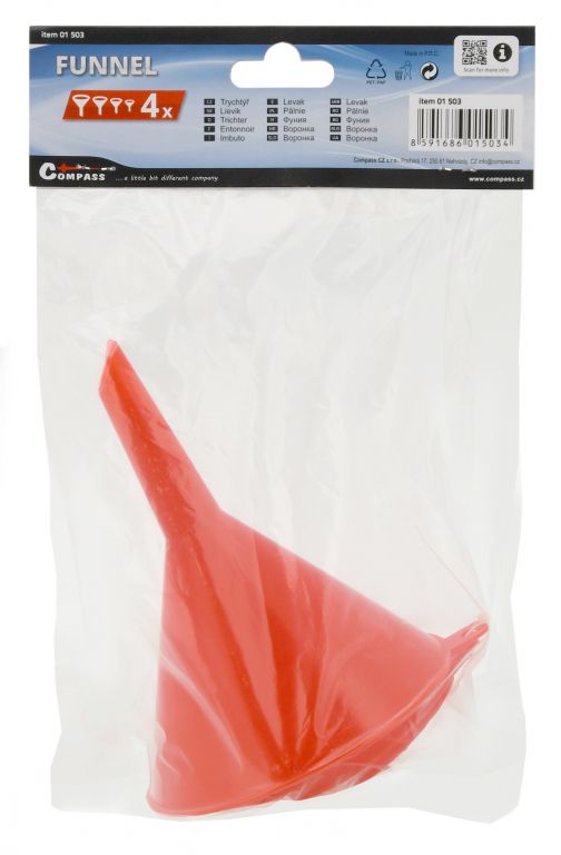 Univerzálna 4 dielna sada lievikov na prelievanie kvapalín. Jednotlivé kusy sú opatrené očkom pre možnosť zavesenia a sú rozmerovo odstupňované pre najrôznejšie použitie. V sade sú lieviky s priemermi 52 - 118 mm s celkovou výškou 80 - 150 mm.