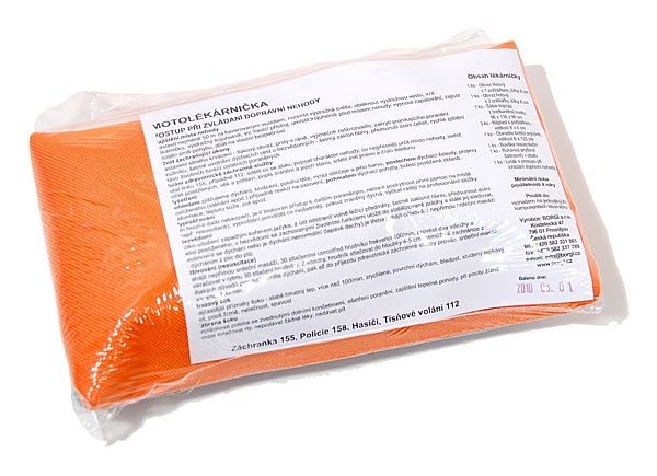 Lekárnička pre motocykle, obsah zodpovedá Zákonu č. 106/2018 Z. z. Prevedenie: textilná taška. Lekárnička je súčasťou povinnej výbavy motocyklov a skútrov.