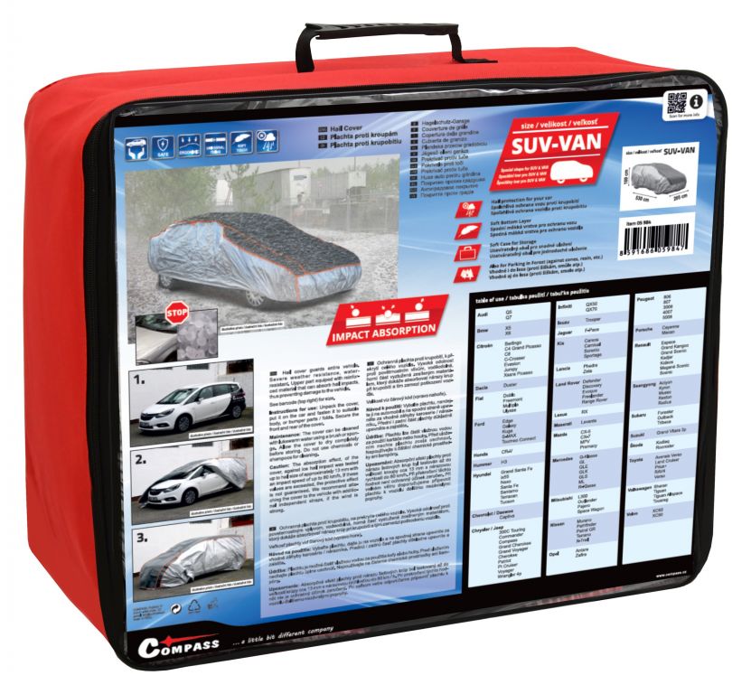 Ochranná plachta proti krupobitiu, na prekrytie celého vozidla s vysokou odolnosťou proti poveternostným vplyvom. Horná časť vystužená zosilneným materiálom, ktorý dokáže absorbovať nárazy krúp pri krupobití a tým zamedzí poškodenie vozidla. Jednoduché upevnenie plachty - iba sa nasadí na automobil, na spodku sa upevní časť so všitou gumou za vhodné záhyby karosérie / nárazníka a predná aj zadná časť plachty sa dôkladne upevní pomocou všitých popruhov so sponami. Absorpčný efekt plachty proti nárazu ľadových krúp je vysoko účinný až do veľkosti krúpy cca 12 mm s nárazovou rýchlosťou do 74 km/h. Pri prekročení týchto hodnôt nie je ochranný účinok zaručený.