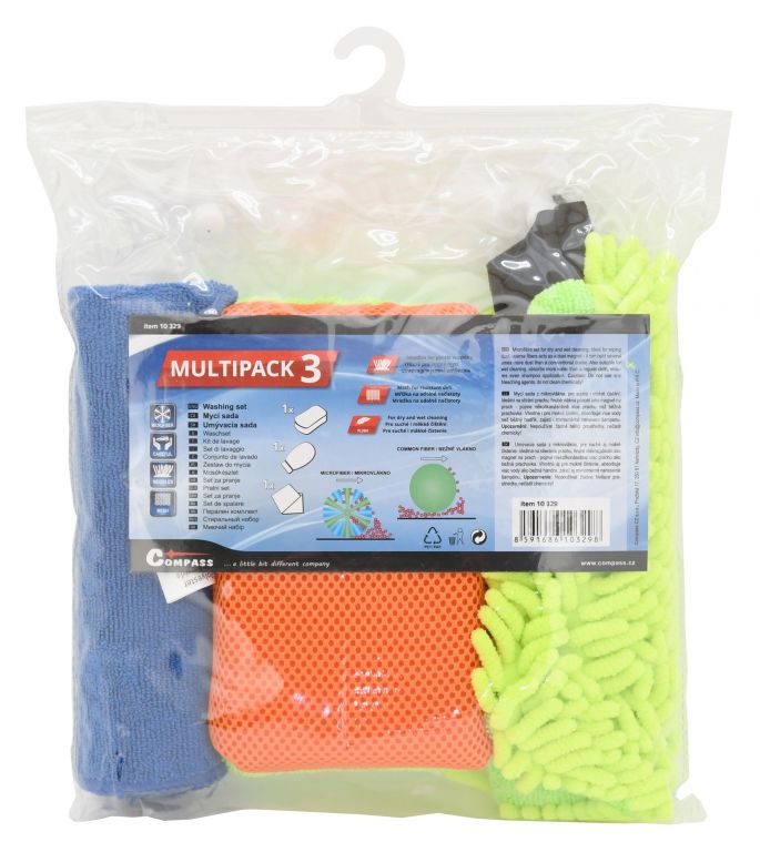Multipack 3 je sada určená na komplexné umývanie vozidla a následnú aplikáciu ošetrenia karosérie. Jednotlivé prvky sady boli vybrané v duchu moderných trendov na umývanie vozidiel. Na šetrné umývanie sú k dispozícii umývacie rukavice z mikrovlákna so strapcami dĺžky 2,5 cm na jednej strane a jemnou mikrovlákenou vrstvou na strane druhej. Ďalšou súčasťou je špongia opatrená jemnou mikrovlákenou vrstvou, ktorá je obzvlášť vhodná na nanášanie a následné rozleštenie voskov a iných prostriedkov. Druhá strana špongie je opatrená mriežkovanou vrstvou vhodnou na čistenie odolných nečistôt. Neoddeliteľnou súčasťou pre efektívne umývanie vozidla je aj mikrovlákenná handrička, ktorá môže byť použitá buď na osušenie vozidla (ľahko navlhčená mikrovlákenná handrička efektívne saje vodu), alebo na nanesenie finálneho vosku. Handričku možno použiť aj na iné účely. Rukavica so strapcami je ideálna na použitie metódou dvoch vedier, kedy v jednom je voda s autošampónom a v druhom samotná voda na oplach zachytených nečistôt na rukavici.