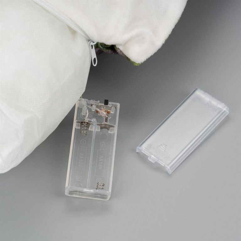 Sú potrebné dve AA batérie, ktoré nie sú súčasťou balenia. Na zapnutie alebo vypnutie svetla je nutné otvoriť zips vankúša a posunúť tlačidlo na krabičke na batérie.