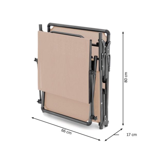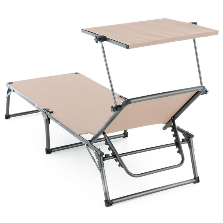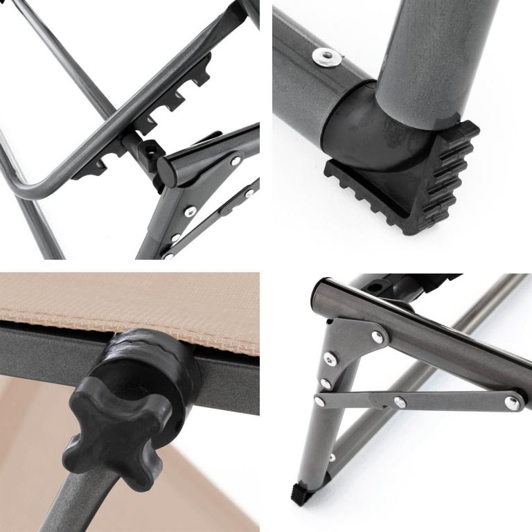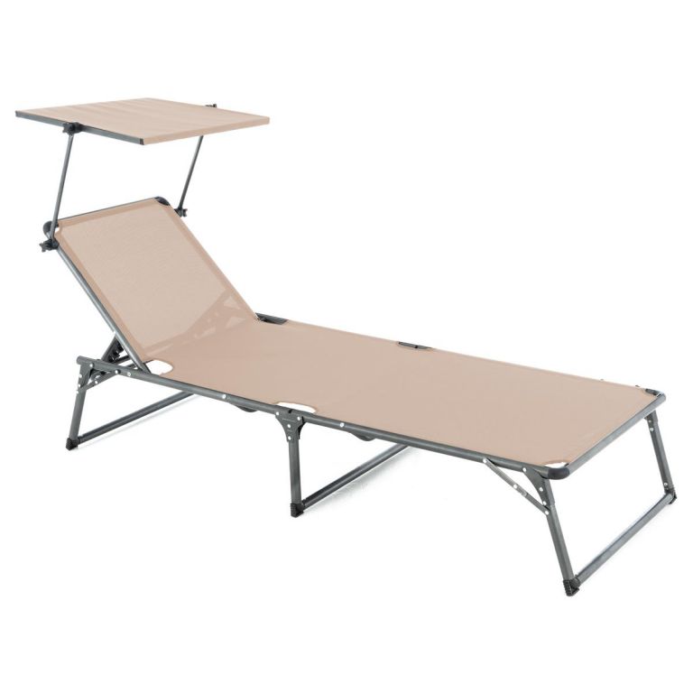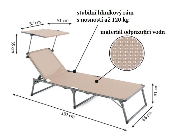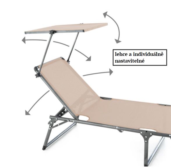 Plážové ležadlo je nastaviteľné do 5 pozícií. Sklopná strieška poslúži ako praktická ochrana proti slnku. Hliníkový rám je mimoriadne robustný a vďaka trom oporným nohám a protišmykovým krytkám s ochranou proti poškriabaniu ponúka stabilné státie na akomkoľvek povrchu. Relaxačné ležadlo je vybavené vodotesným poťahom a možno ho behom chvíľky zložiť. Vďaka svojej skladnosti je vhodným vybavením pre letné cestovanie. Väčšie rozmery lehátka zaručia mimoriadne pohodlie.