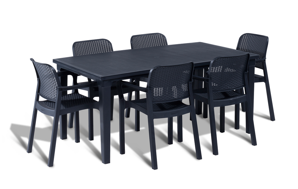Záhradné plastové kreslo vo farbe antracit. Moderný dizajn, ľahká údržba, vysoká odolnosť. Kreslá sa na seba nedájú stohovať.