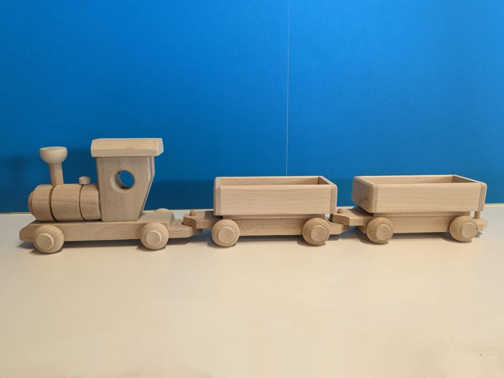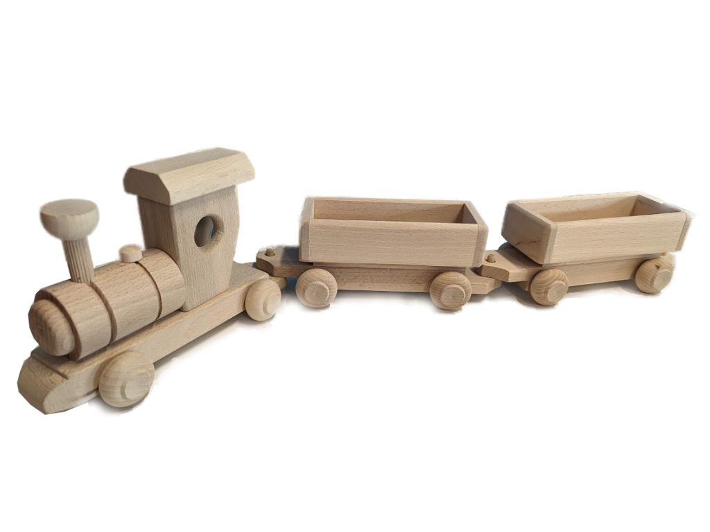 Vláčik s vagónmi je vyrobený z masívneho bukového dreva, ktoré nie je povrchovo ošetrené. Hračka z masívneho bukového dreva Vám vydrží niekoľko generácií. Všetko je precízne spracované, drevo obrúsené, kolesá sa dajú otáčať. Vágónky vláčika sa dajú pohodlne odopnúť, môžu prevážať najrôznejšie veci.
