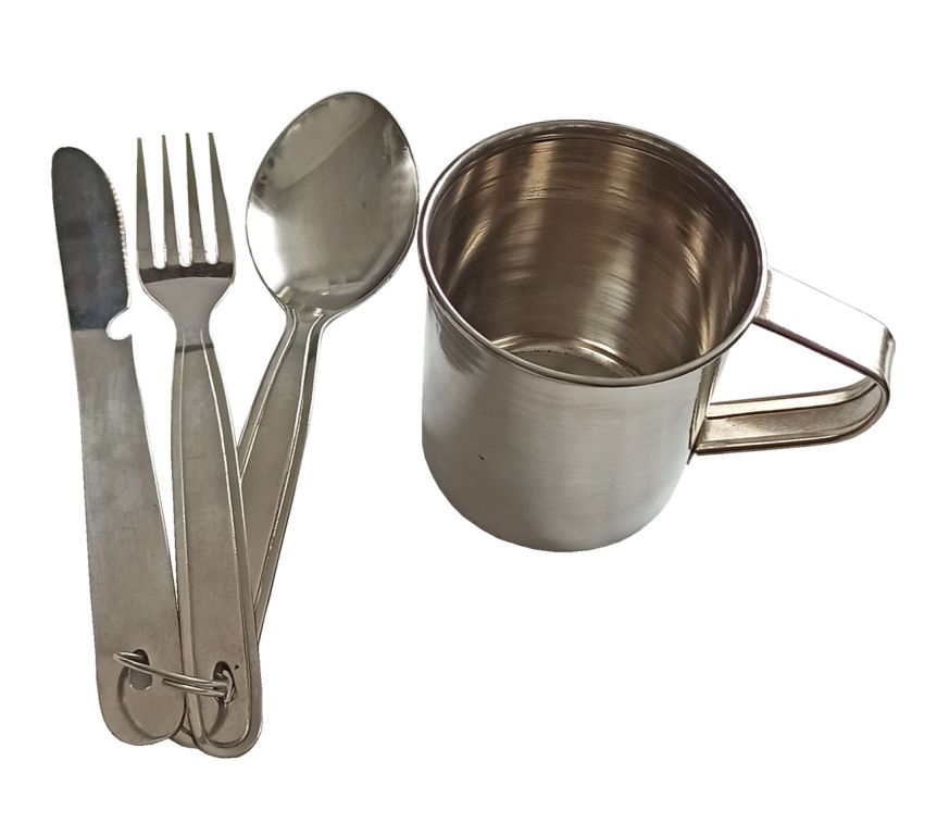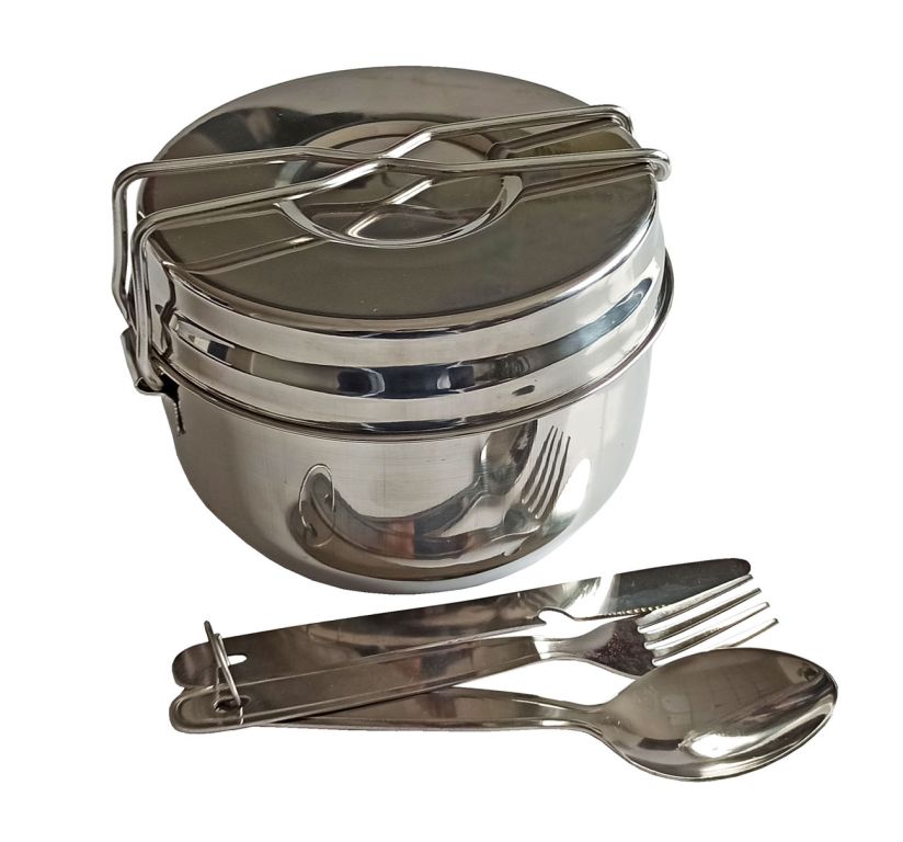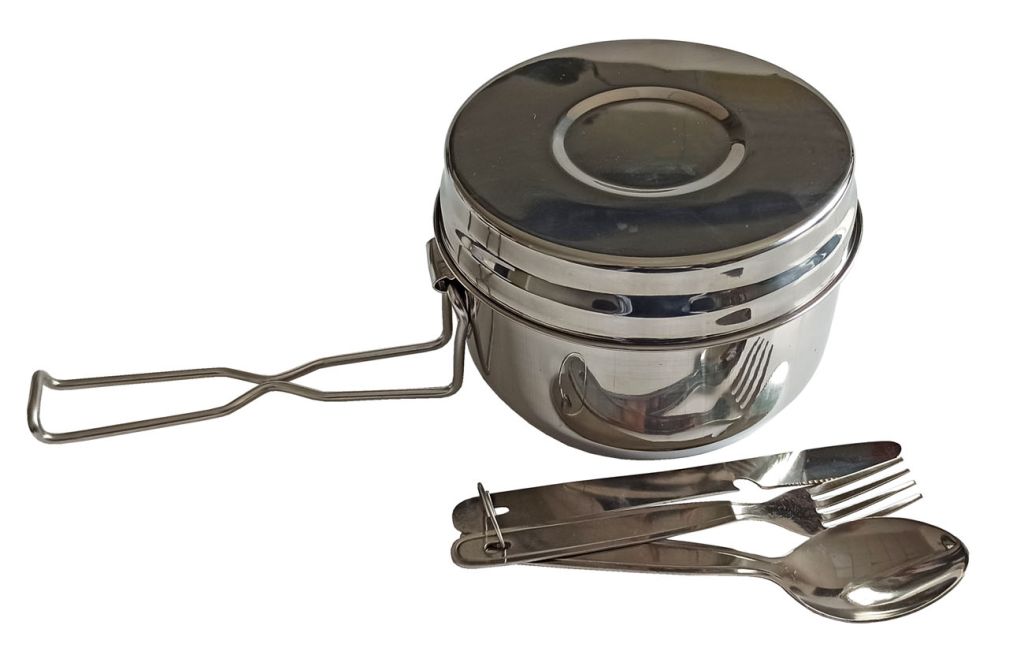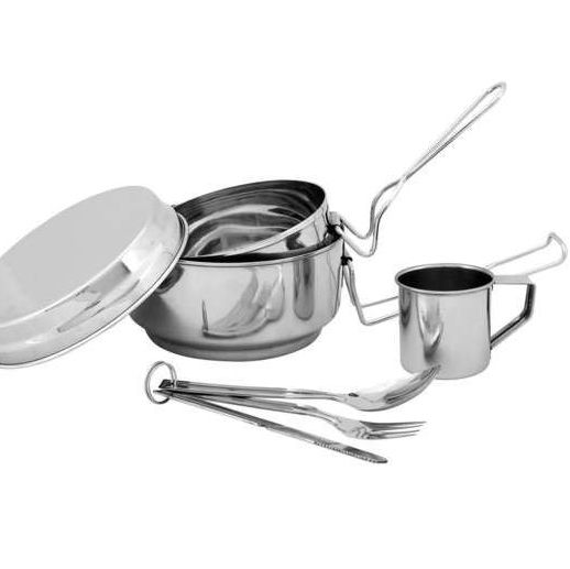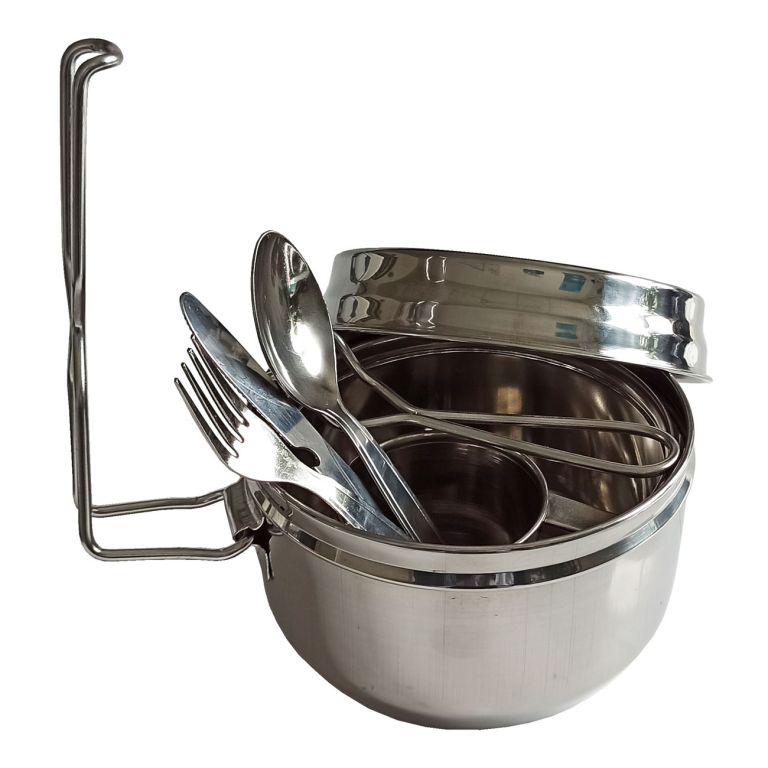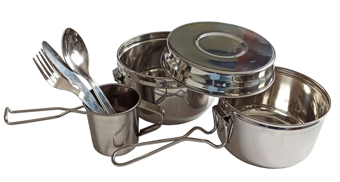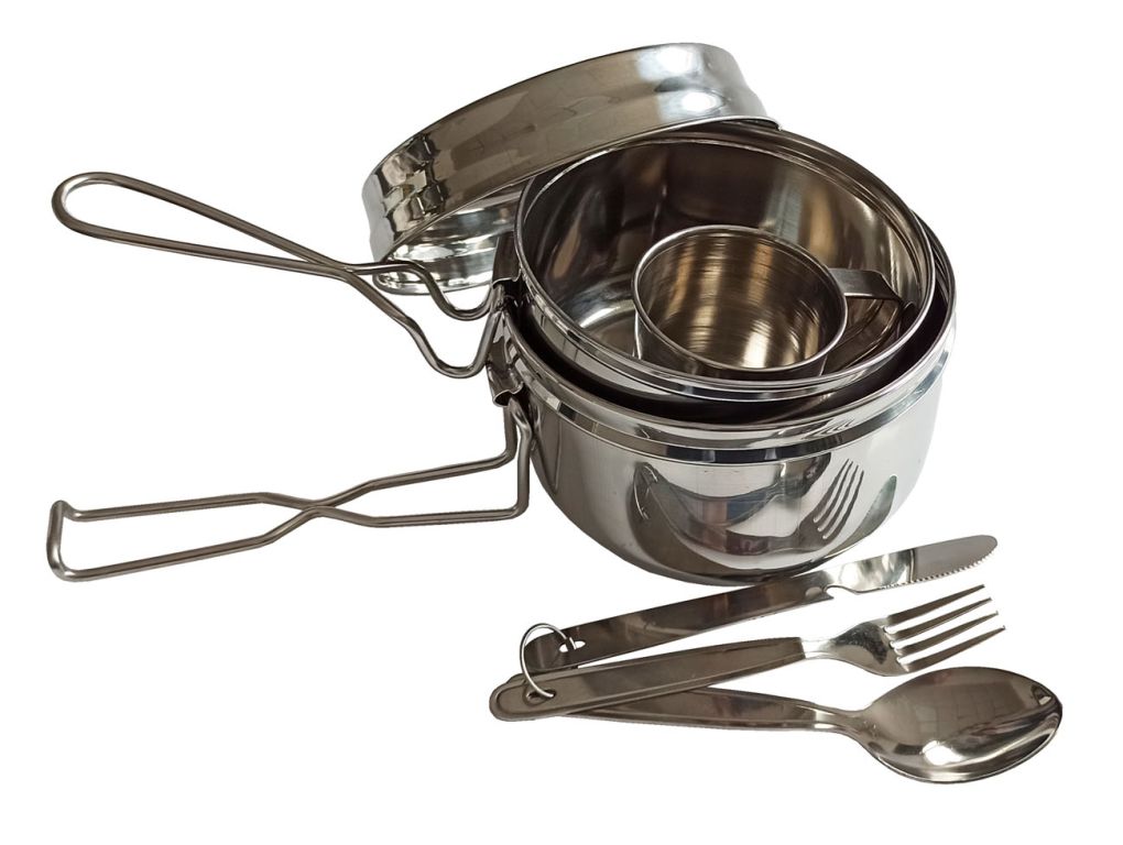 Kempingová sada riadu veľká je 7-dielna sada nerezového riadu.
