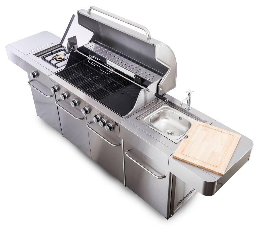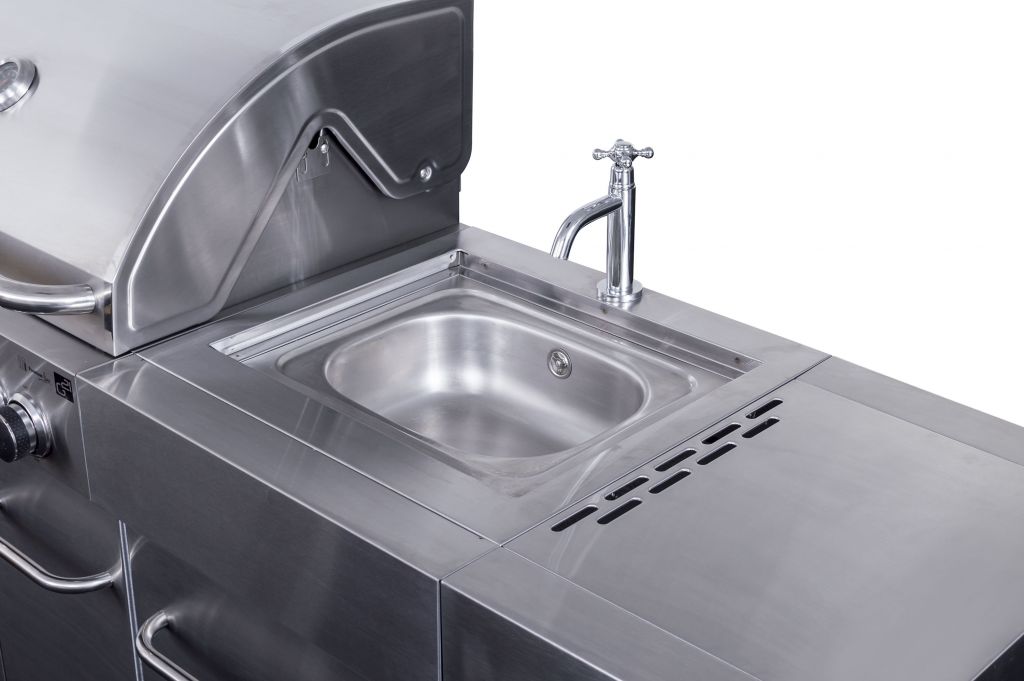 Vstavaný drez má aj prívod na vodu zo záhradnej hadice. A po opláchnutí riadu drez len zakryte doskou a okamžite získate väčšiu pracovnú plochu na prípravu pochúťok na letné grilovanie. Pod horákmi a drezom sú vstavané skrinky s dvierkami na ochranu uložených vecí pred počasím alebo prachom. Uskladnite tu grilovacie náčinie aj riad alebo plynovú bombu v dňoch, kedy gril nepoužívate.