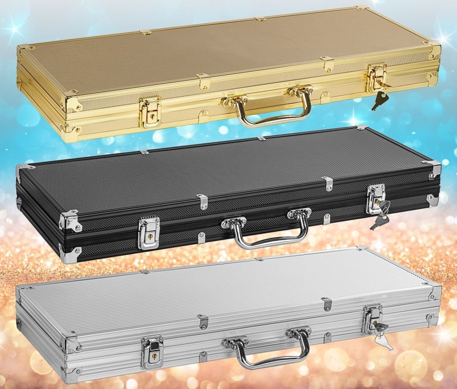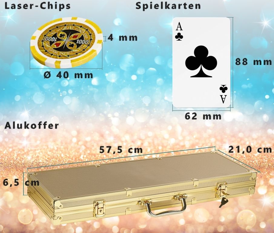 500 ks laserových obojstranných žetónov v kufríku s reflexnými hologramami a navyše karty, kocky a placky s nápismi. To všetko v praktickom a navyše štýlovom hliníkovom kufri, ktorý zaručí, že sa vám žetóny do ďalšej hry nerozkotúľajú. Nikto neodolá zábave ako z Las Vegas. Vyskúšajte a uvidíte.