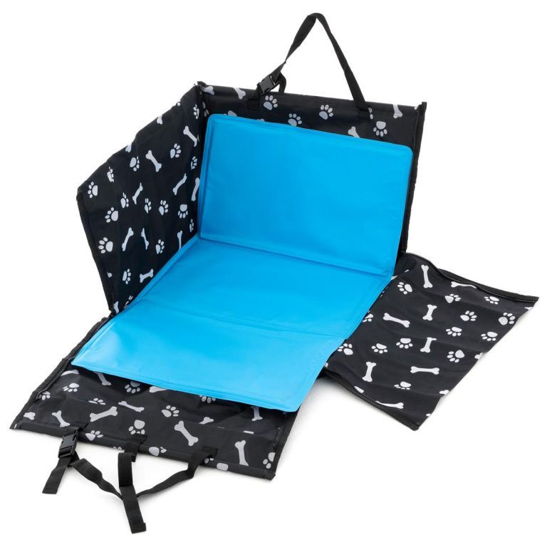 Tašku do auta možno použiť mnohými spôsobmi, či už ako ochranu proti zvieracím chlpom a nečistotám, alebo ako chladiacu tašku do auta na potraviny alebo nápoje. Vďaka postranným zipsom je možné z tašky vo chvíli vytvoriť polstrovaný poťah pre pohodlný odpočinok. Upevňovacie pásky možno v aute pripevniť podľa potreby a protišmykový povrch zaistí lepšiu stabilitu tašky a zabezpečí tak bezpečné miesto pre Vašeho miláčika. Účinok chladiacej podložky, ktorá je tiež súčasťou tašky, funguje po dobu niekoľkých hodín bez ďalších potrebných zdrojov a možno ju použiť do pelechu alebo psie búdy. Chladiaca podložka absorbuje telesné teplo a odvádza ho späť do vzduchu. Vďaka všestrannému využitiu ju môžete použiť ako podložku pod notebook. Podložka je vodotesná a na údržbu postačí iba vlhká handrička a saponát.