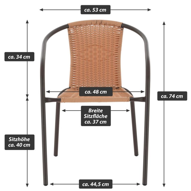 Táto bistro stolička je vhodná pre pravú stredomorskú atmosféru u vás doma. Nohy stoličky sú opatrené gumovými krytkami. Zabraňujú pošmyknutiu, tlmia hluk pri pohybe a sú šetrné k podlahe. Rám je vyrobený z práškovo lakovanej ocele s kladivkovou povrchovou úpravou. Polyratan je vyrobený z plastu, je odolný proti roztrhnutiu a zaujímavo tkaný.