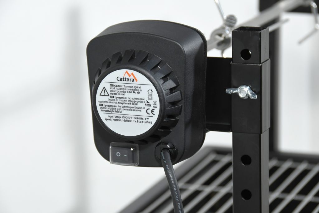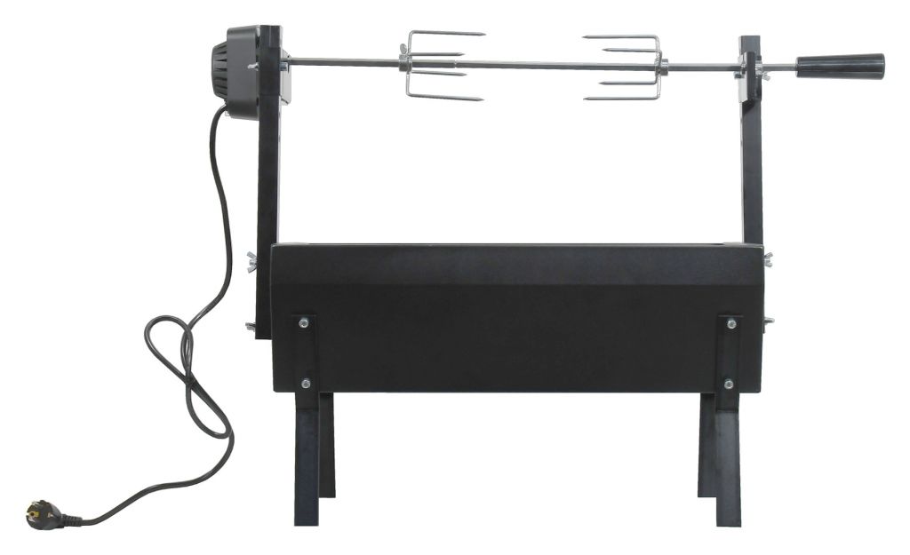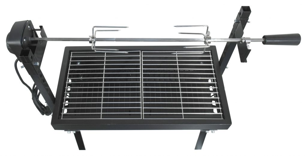 Konštrukcia z ocele je vybavená odolnou farbou. Pre samotnú tepelnú prípravu Vašich pochutín je gril vybavený dvojdielnym oceľovým roštom s kompletnými rozmermi. V spodnej časti má gril masívne bočné otvory na prúdenie vzduchu. Kovové nohy potom zaisťujú vysokú stabilitu celku. Gril je doplnený výkonným motorom s napájaním na 230V pre otáčanie pokrmov, otáčanie je ľavo aj pravo točivé, pri každom vypnutí a následnom zapnutí motora sa smer zmení. Na vidlice - motor - je možné naložiť až 8 kg pokrmov. Pri rýchlosti otáčania (približne 2 otáčky za minútu) je zaistené to najrovnomernejšie prepečenie.