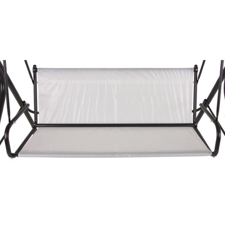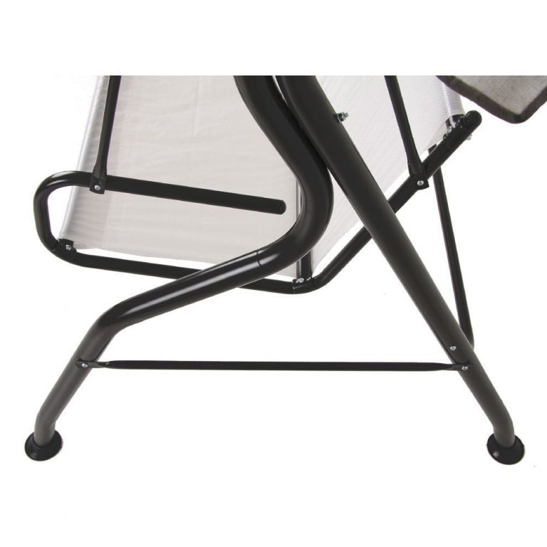 Hojdačka pre 3 osoby s pevnou konštrukciou. Rám maľovaný práškovou polyesterovo - epoxidovou antracitovou farbou. Strieška vyrobená z polyesteru, má špeciálne tunely prispôsobené na strešnú konštrukciu hojdačky. V sade tiež 2 prešívané sedáky. Vrch sedadla z bavlny, spodok z lustrasilu. Obšité lemom z polyesteru. V opornej časti šnúrky na pripevnenie k rámu. Strieška z bavlnenej tkaniny vo farbe sedákov.