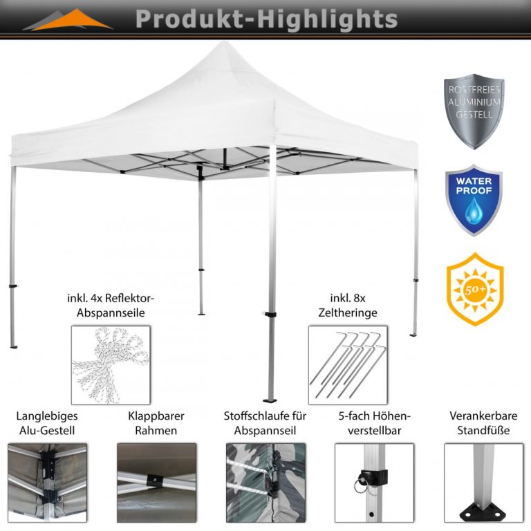 Skladací stan je vysoko kvalitne spracovaný. Stan je 100 % funkčný. Je totiž vodotesný a vďaka špeciálne impregnovanej strešnej krytine blokuje až 98 % UV slnečného žiarenia. Nerezový rám poskytuje ochranu voči poškriabaniu a korózii. Pre ďalšiu stabilitu a podporu slúžia zväčšené nohy konštrukcie, extrastabilný spojovací materiál a vysoko kvalitný klikací systém so zaistením vonkajšou skrutkou s ťažným krúžkom. Pre podporu strechy je intergrovaný stredový napínací stĺpik.