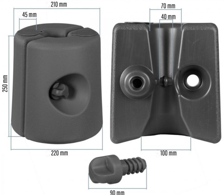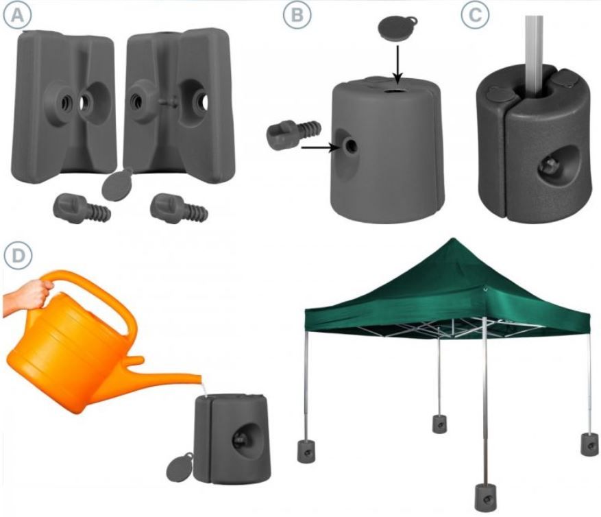 Tieto závažia zaistia bezpečné zaistenie pre všetky stojné nohy o priemere tyče 20 - 40 mm. Závažie je určené pre stojné nohy párty stanov a markíz. Montáž je veľmi jednoduchá a nie je potrebné žiadne náradie. Závažie je možné plniť vodou, pieskom alebo okruhliakmi.