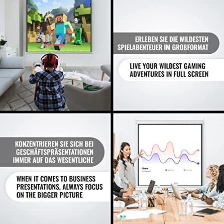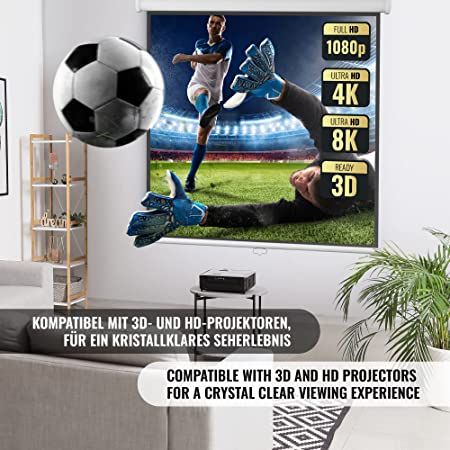 Na obrazovke s uhlopriečkou 85 palcov alebo 215 cm si môžete vychutnať filmy, seriály, dokumenty a podobne vo formáte podľa vlastného výberu. Jeho pretáčaním môžete rýchlo a plynule nastaviť pomer strán 1: 1, 4: 3, 16: 9 alebo iný. Samonavíjacie rolovacie plátno s plnou podporou 3D a HD je ideálny pre domácu zábavu, ale aj pre prezentácie a semináre. Vinylom potiahnutá tkanina sa ľahko čistí a je odolná. Čierne maskovanie okrajov po stranách a čierna zadná strana obrazovky zaisťujú optimálny kontrast. Záťažová tyč zabraňuje nevzhľadným záhybom.