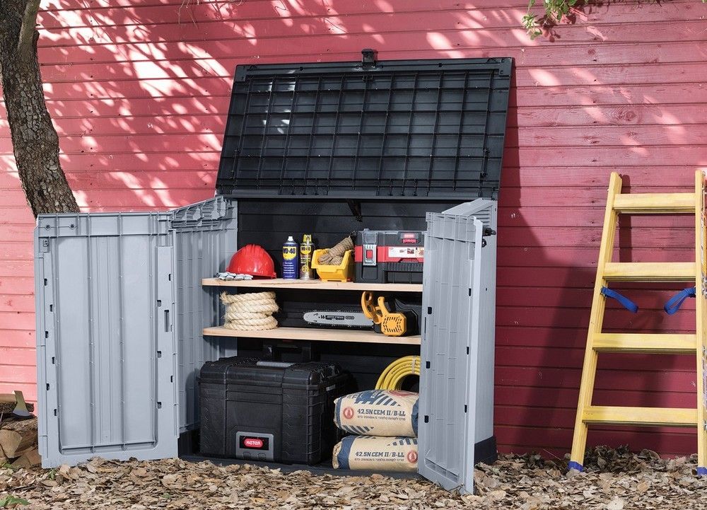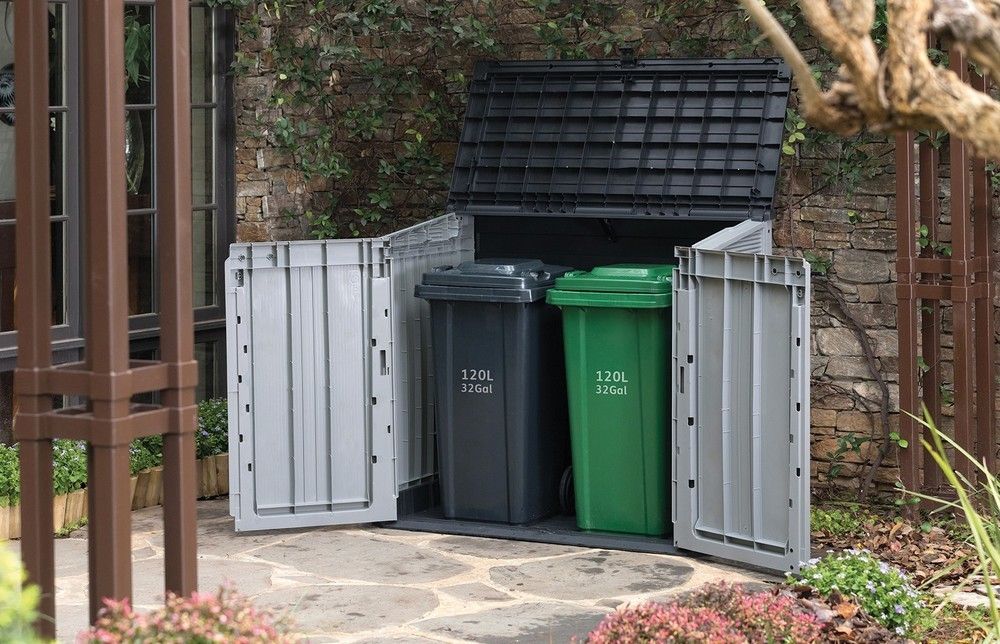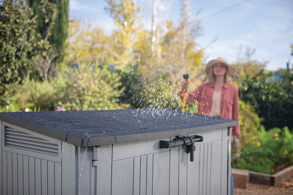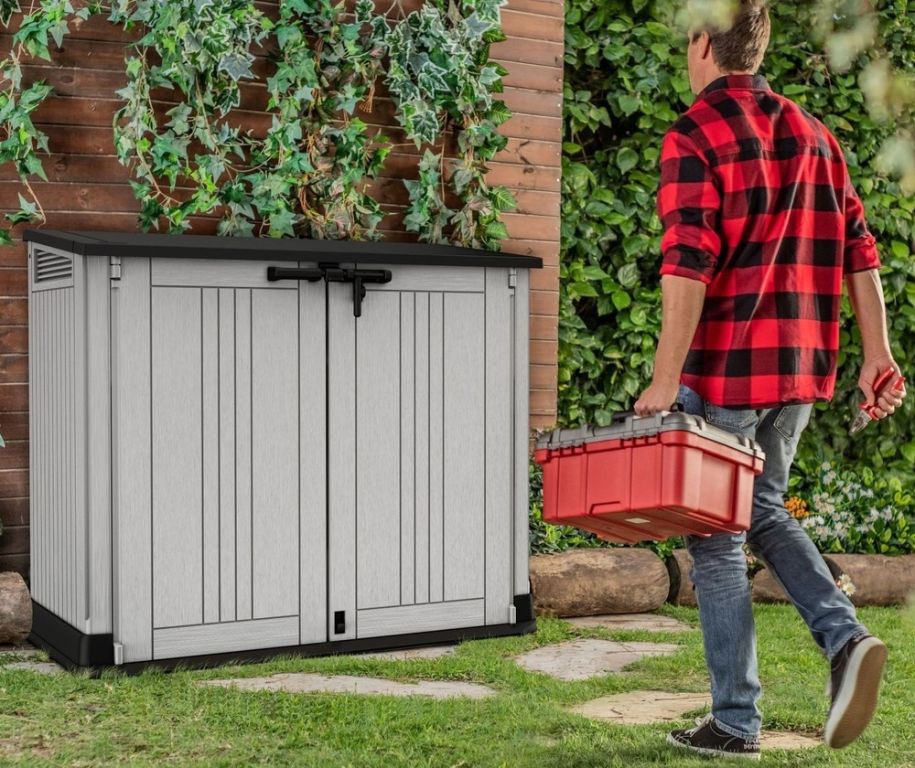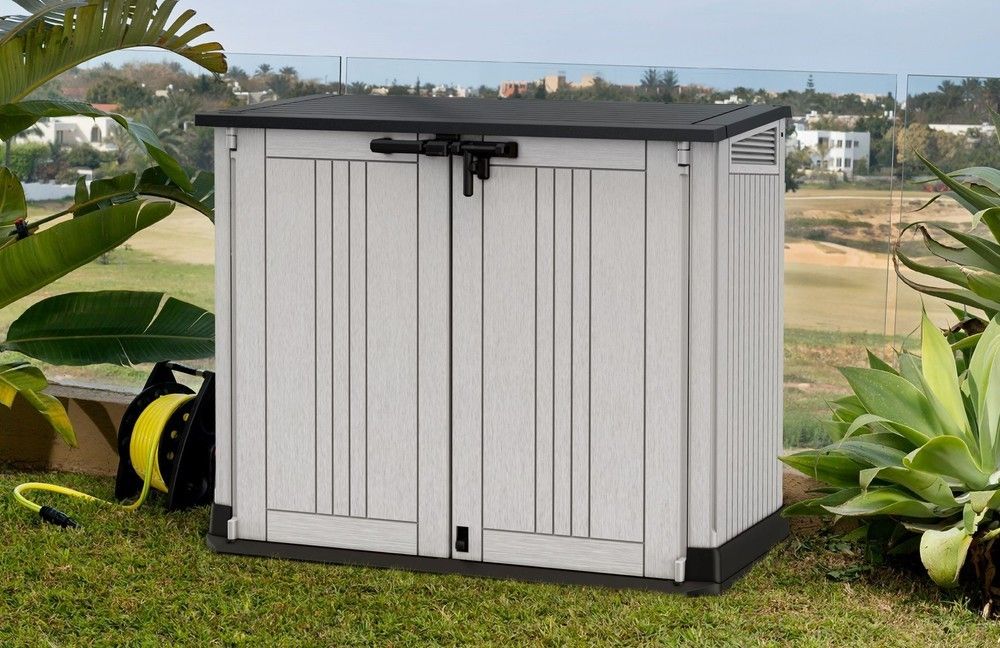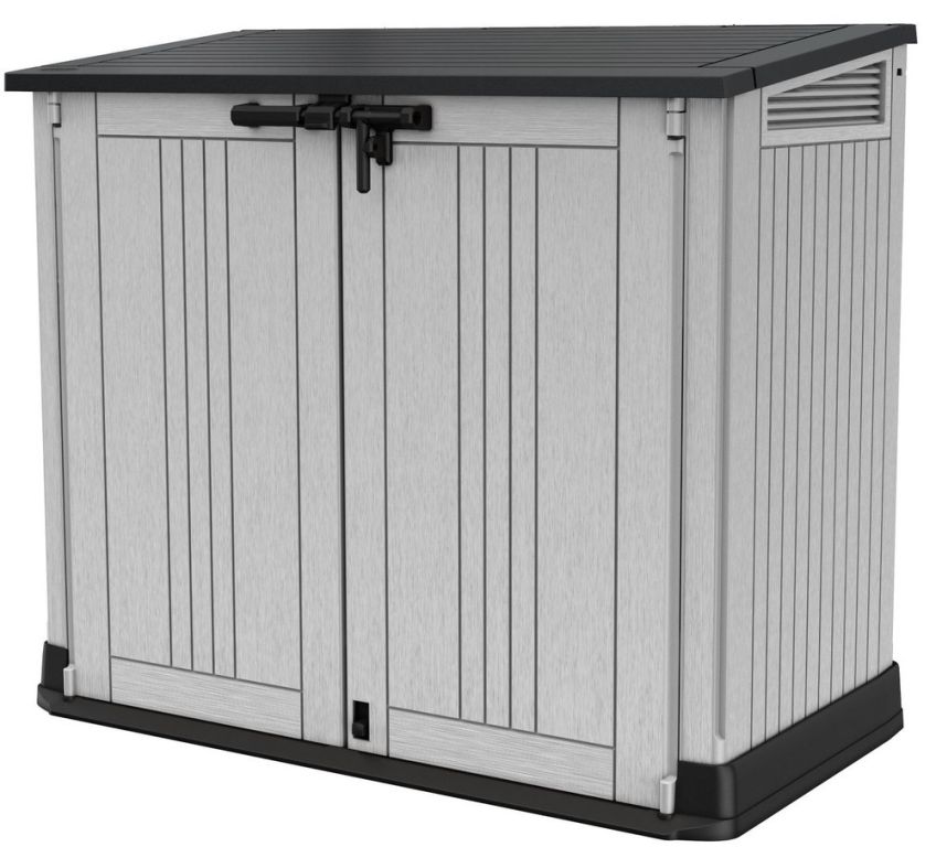 STORE IT OUT MIDI v novom dizajne je vyrobená z kvalitnejších a pevnejších materiálov, ktoré zaručujú ešte dlhšiu životnosť produktu. Úložná skrinka sa vyznačuje jednoduchým a elegantným dizajnom, štruktúra povrchu pripomína prírodné drevo. Úložná skriňa sa hodí všade, kde je nutné uschovať záhradné doplnky, náradie alebo napr. popolnice (dve popolnice s objemom 120 l). Robustný rám chráni uložené predmety pred vlhkosťou, zatiaľ čo vysoko kvalitné plastové materiály zaistia trvanlivosť výrobku po mnoho rokov. Otvoriť skriňu je možné zhora či spredu, je uzamykateľná. Odvetrávanie.