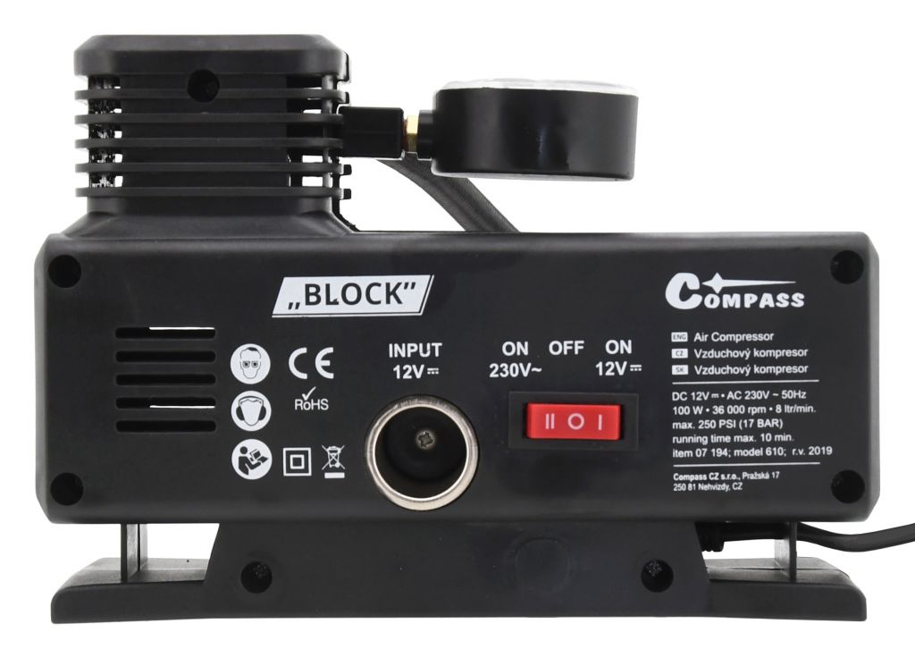 Vzduchový kompresor s vysokou účinosťou a napájaním 12 V / 230 V. Napájacie káble aj hustiace hadice majú dostatočnú dĺžku 12 V - 260 cm / 230 V - 150 cm a hadice 0,5 m. Komprosor je vybavený vstavaným pneumeračom, ktorý zobrazuje nameraný tlak niekoľkých jednotkách.