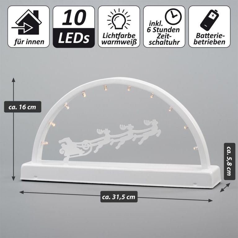 Tento kovový svetelný oblúk v polkruhovom tvare, vybavený 10 teplými bielymi LED diódami, navodí u vás doma vianočnú atmosféru, je krásnym pútačom a slávnostne ozdobí vaše okno. Teplé osvetlenie dekoratívneho lustra s motívom Santa Clausa na saniach a soboch vytvára útulnú atmosféru v adventnom a vianočnom období. Nízka spotreba energie sviečkového mosta vďaka LED technológii. Prevádzka na batérie znamená, že ste nezávislí na zásuvkách a svetelný oblúk môžete umiestniť kdekoľvek v miestnosti. Trieda ochrany IP20 – testovaná bezpečnosť Integrovaný je praktický časovač. Nastavte dobu horenia na 6 hodín a potom 18-hodinovú prestávku. Nemusíte ho teda zapínať za súmraku alebo premýšľať o jeho vypnutí uprostred noci. Voliteľná funkcia časovača alebo trvalého svietenia. Doplňte svoju sviatočnú výzdobu o ďalšie skvelé zimné, vianočné a letné svetelné dekorácie ako sú svetelné reťaze, svetelné stromčeky, svetelné siete, svetelné závesy, LED vetvy, čačky, hviezdy, soby, lucerny a sviečky z nášho sortimentu.
