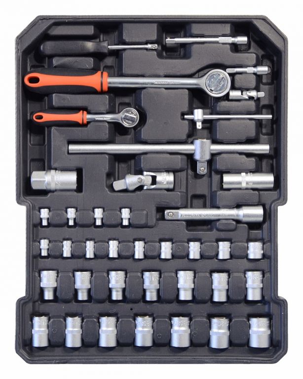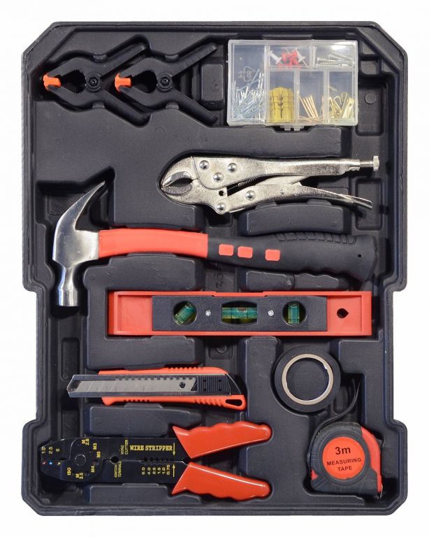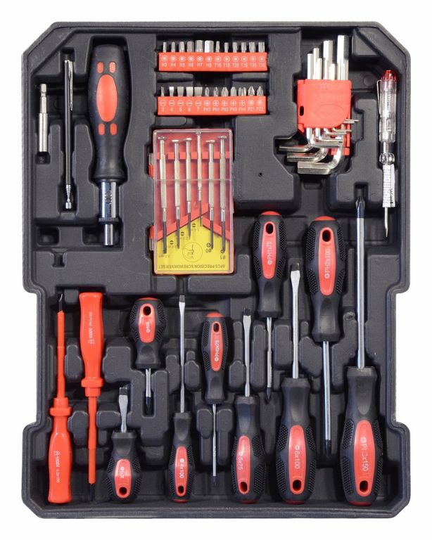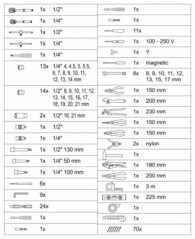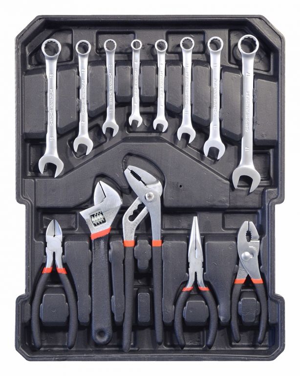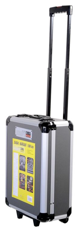 Kufrík je vybavený teleskopickým úchytom a kolieskami, vďaka ktorým je manipulácia s celou sadou náradia veľmi jednoduchá. Sada obsahuje celý rad klieští, skrutkovačov, gola kľúčov, kladivo, vodováhu, stranové aj imbus kľúče, bity, základný spojovací materiál a celý rad ďalšieho náradia, ktoré je vhodné pre použitie ako doma, v garáži, tak aj na cestách.