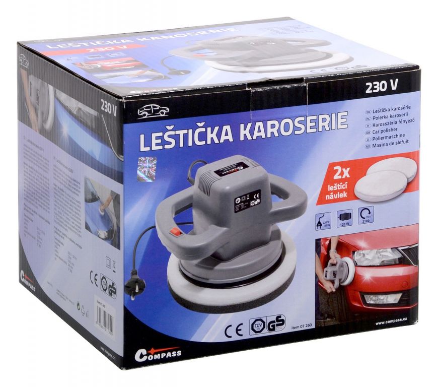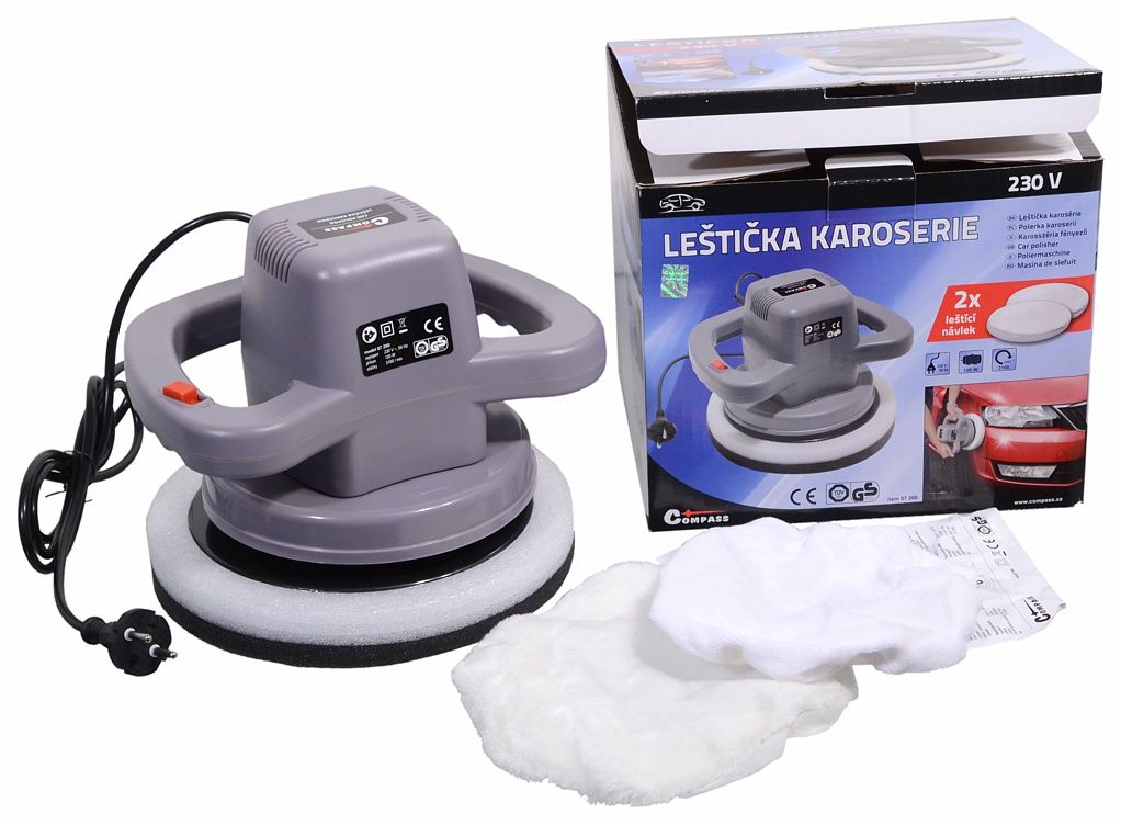Napájanie 230 V, vymeniteľné leštiace poťahy kotúča na nanášanie aj leštenie. Súčasťou balenia sú aj dva kryty (návleky) na leštičku.