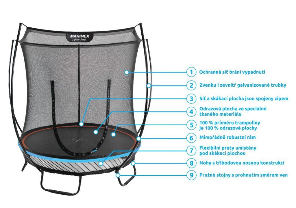 Trampolína Marimex FreeJump je nový prémiový rad. Bezpečnostná sieť je pevne spojená so skákacou plochou. Tradičné pružiny sú nahradené flexibilnými prútmi zo špeciálnej ocele, ktorá vyniká vysokou mierou húževnatosti. 100% priemeru trampolíny = 100% skákacej plochy. Unikátne konštrukčné riešenie umožňuje využiť 100% priemeru trampolíny na skákanie, a to pri zachovaní vysokých nárokov na bezpečnosť a stabilitu. Pružiaci systém je umiestnený pod skákacou plochou trampolíny. Materiál odrazovej plochy je zo špeciálne tkaného materiálu. Skákacia plocha bola testovaná na 3 milióny rázov. Vnútornú ochrannú sieť nájdete priamo v balení, nemusíte si ju dokupovať zvlášť. Vnútorná ochranná sieť je bezpečnejšia ako vonkajšia sieť - bráni prístupu skákajúceho do časti s pružinami. Medzera medzi ochrannou sieťou a skákacou plochou trampolíny je vyplnená zipsom. Aktuálne na trhu je to najbezpečnejšie riešenie spoja. Ochranná sieť bráni vypadnutiu. Tyče sú obalené ochranným návlekom z mäkčenej peny. Nohy trampolíny sú samostatné a zvyšujú stabilitu celej trampolíny. Spojenie tyčí nôh trampolíny a siete je istené špeciálnymi sponami.