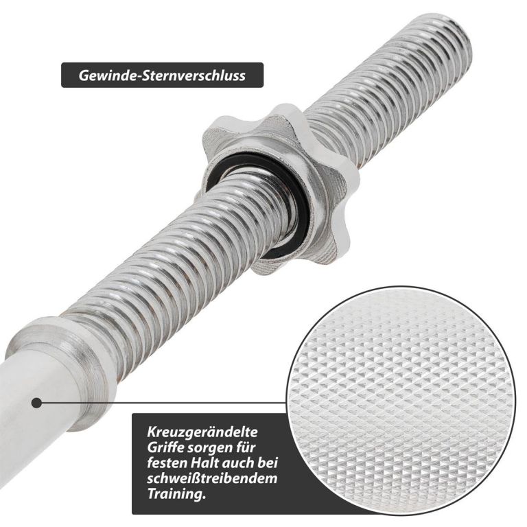 Podperná tyč na činky MAXXIVA® je vhodná pre všetky komerčne dostupné záťažové dosky s 3 cm držiakom dosky. Pultová doska je upevnená poistným krúžkom, ktorý zabraňuje skĺznutiu závažia počas pohybu. Rýchlovýmenné hviezdicové zámky bezpečne upevňujú závažia na činku a zaručujú pohodlnú výmenu závaží. Rukoväte s krížovým závitom na tyči umožňujú bezpečné uchopenie tyče.