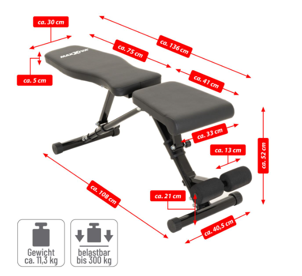 MAXXIVA posilňovacia lavica, nastaviteľná, 108 cm x 40,5 cm
