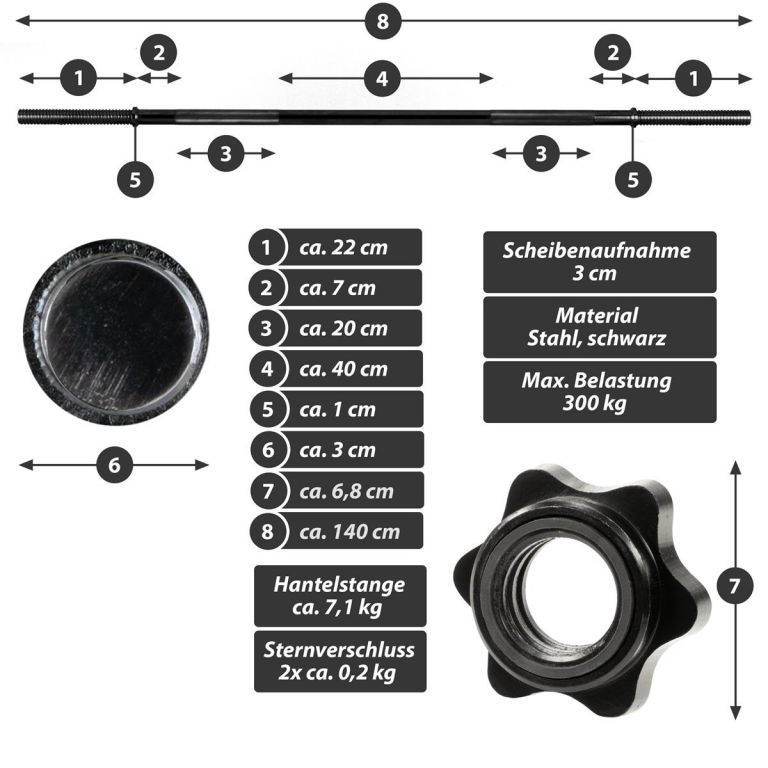 Optimálna činka na použitie v posilňovni aj doma, vhodná pre tréning hrudníka, paží, ramien, krku, posilňovania, rehabilitačné športy, kulturistiku, bench press, mŕtve ťahy, drepy, výpady, kľučky a ďalšie. Je vhodná pre dostupné záťažové dosky s 3 cm držiakom kotúča a priemerom otvoru 30 / 31 mm. Protišmyková doska je upevnená poistným krúžkom, aby sa zabránilo skĺznutiu závažia pri pohybe. Hviezdicové zámky, ktoré je možné rýchlo vymeniť, bezpečne fixujú závažia na tyči činky a zaručujú jednoduchú výmenu závaží. Rukoväte sú krížovo vrúbkované na bezpečné uchopenie.