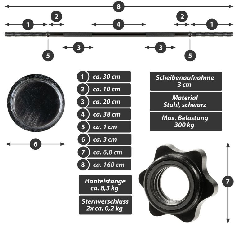 Optimálna činka na použitie v posilňovni aj doma, vhodná pre tréning hrudníka, paží, ramien, krku, posilňovania, rehabilitačné športy, kulturistiku, bench press, mŕtve ťahy, drepy, výpady, kľučky a ďalšie. Je vhodná pre dostupné záťažové dosky s 3 cm držiakom kotúča a priemerom otvoru 30 / 31 mm. Protišmyková doska je upevnená poistným krúžkom, aby sa zabránilo skĺznutiu závažia pri pohybe. Hviezdicové zámky, ktoré je možné rýchlo vymeniť, bezpečne fixujú závažia na tyči činky a zaručujú jednoduchú výmenu závaží. Rukoväte sú krížovo vrúbkované na bezpečné uchopenie.