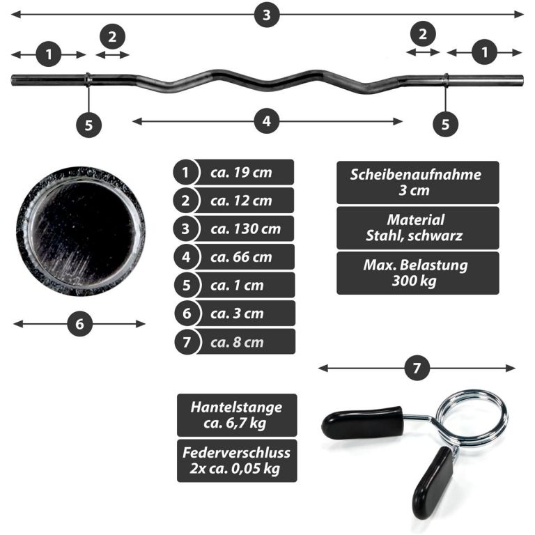 Zakrivený tvar tyče umožňuje rôzne možnosti úchopu na precvičenie rôznych častí svalov a umožňuje precvičiť konkrétne svalové skupiny i komplexné precvičenie celého tela. Ideálne pre náročný tréning s menším zaťažením zápästia ako s jednoručnou činkou. Vďaka zakrivenému tvaru je činka vhodná najmä na efektívny a účinný tréning paží. Pružinové zámky je možné pomerne rýchlo presunúť a opäť bezpečne upevniť, takže je zaručená pevná fixácia závažia.