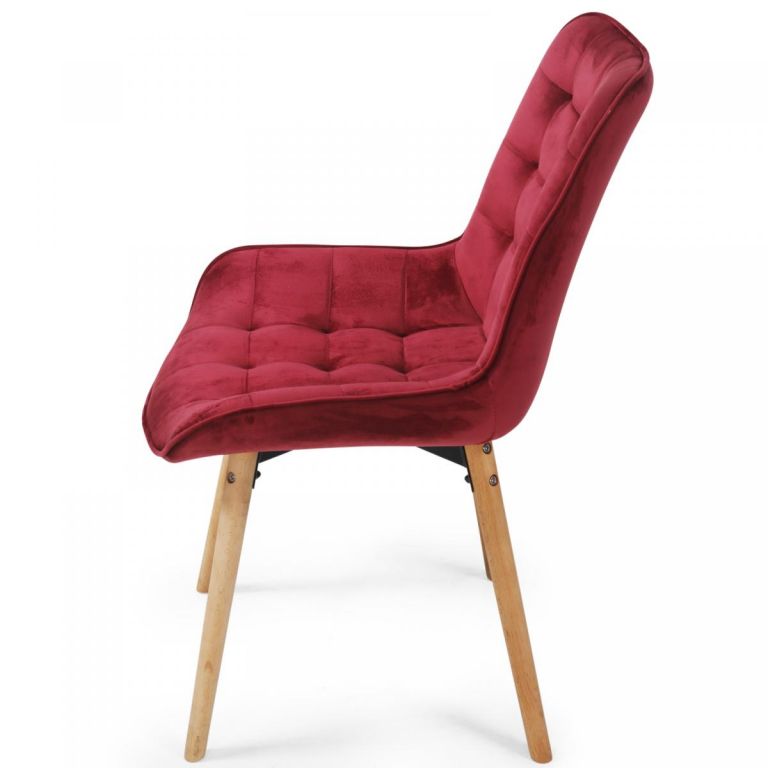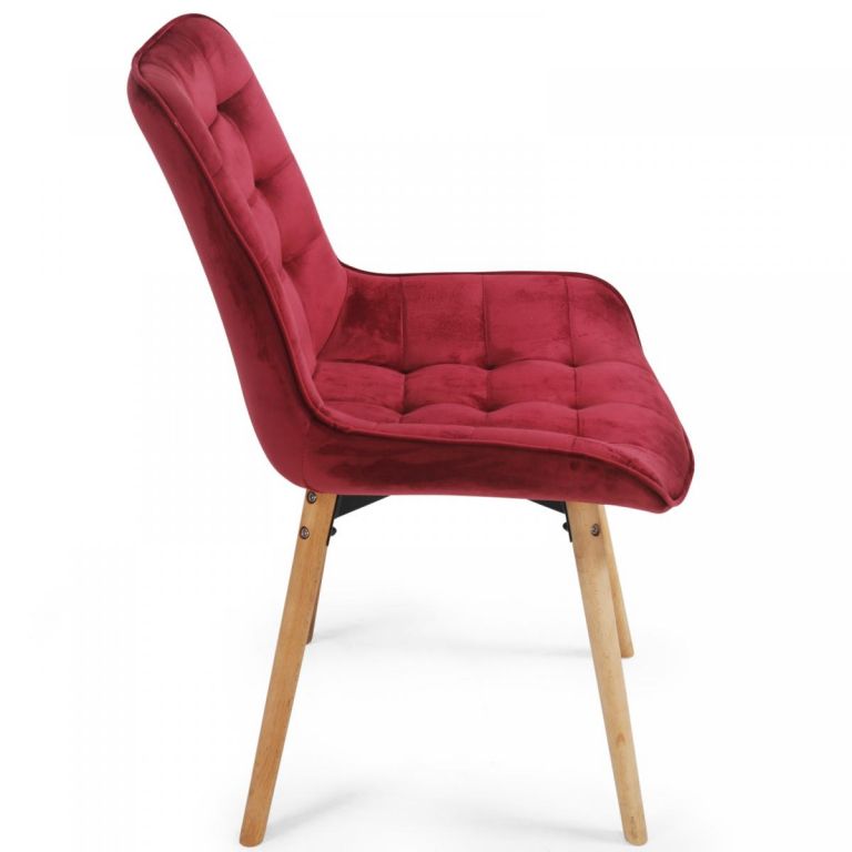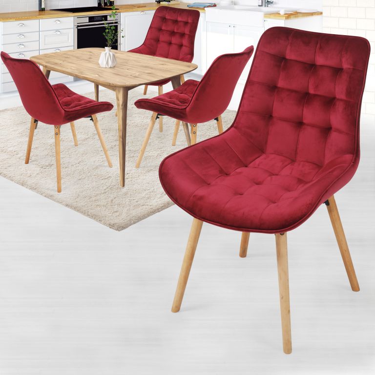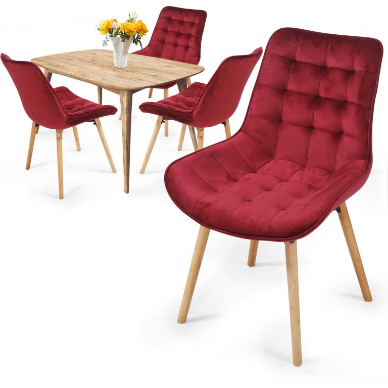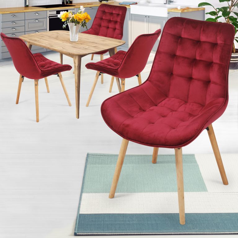 Zamatové stoličky do jedálne v tmavo červenej farbe premenia každé stolovanie na nezabudnuteľný zážitok. Protišmykové nohy sú vyrobené z bukového drev