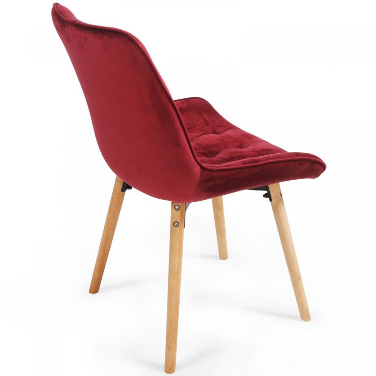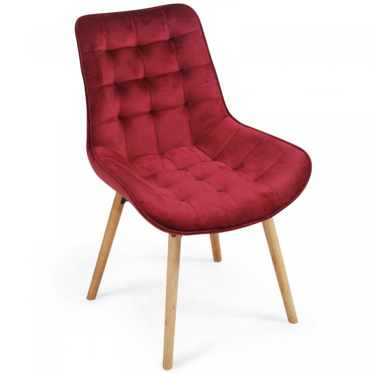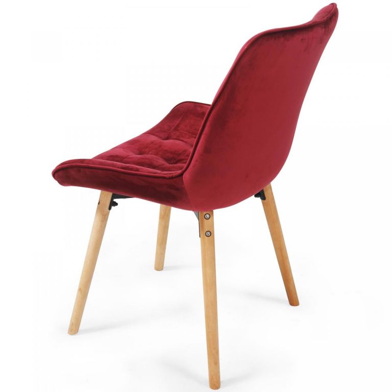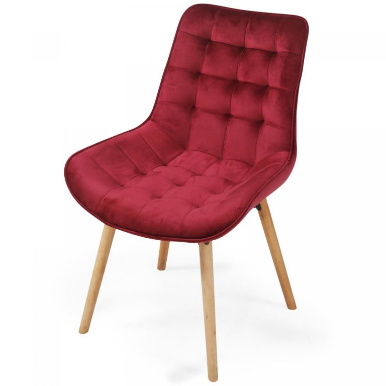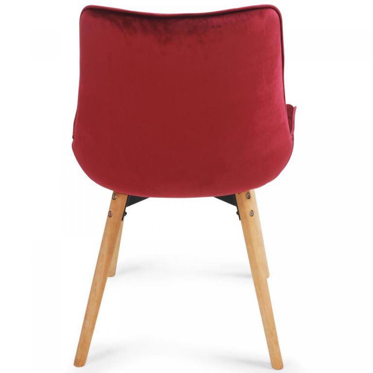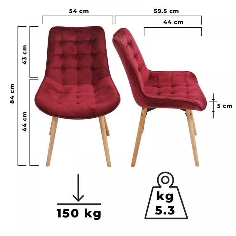 Zamatové stoličky do jedálne v tmavo červenej farbe premenia každé stolovanie na nezabudnuteľný zážitok. Protišmykové nohy sú vyrobené z bukového drev