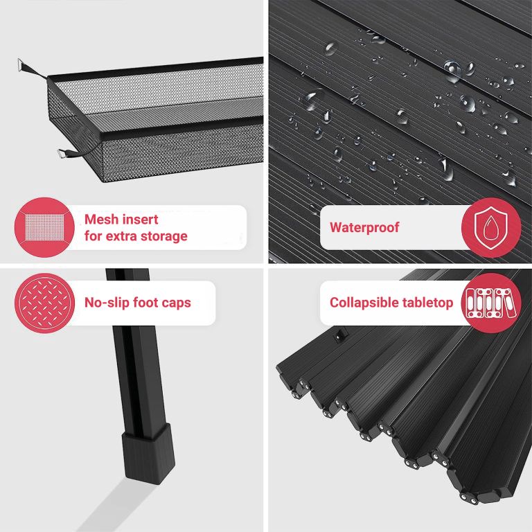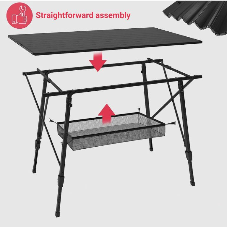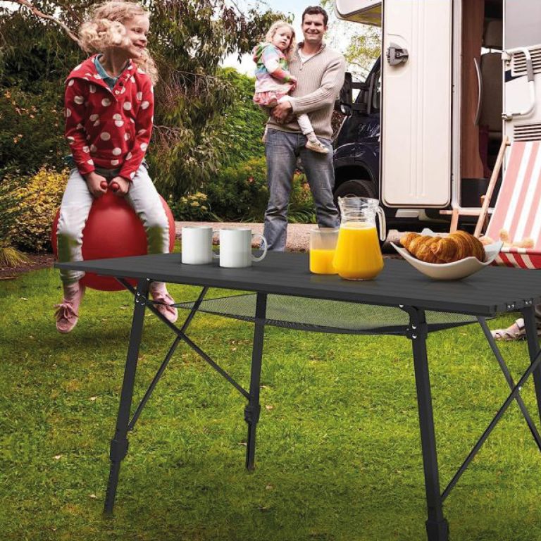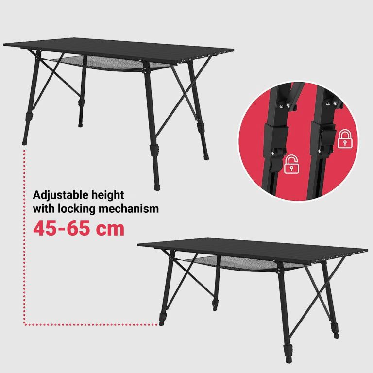 Tento výškovo nastaviteľný kempingový stôl s taškou je vyrobený z extrémne odolnej hliníkovej zliatiny a je spoločníkom na cesty, aj keď cestujete z jedného kempu do druhého. Je dostatočne robustný, aby vydržal každodenné nároky v prírode a na údržbu vám stačí vlhká handrička. Pracovná plocha stola je vybavená prídavnou sieťovou vložkou a ponúka dostatok priestoru, zatiaľ čo sieťový nadstavec pojme všetko, čo potrebujete. Môžete ho umiestniť kamkoľvek – na záhradu, na pláž alebo do kempu. Tieto skladacie stoly sú vhodné na varenie, stravovanie a dokonca aj prácu.