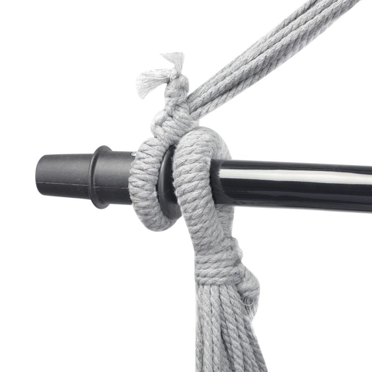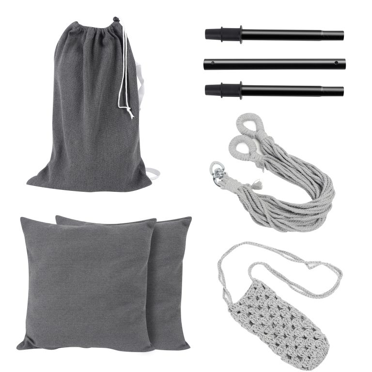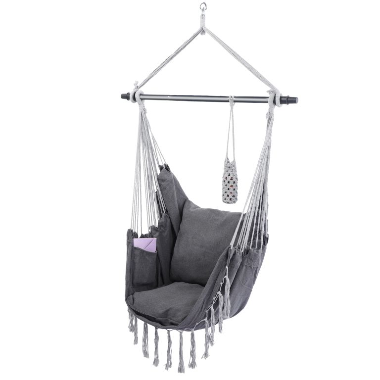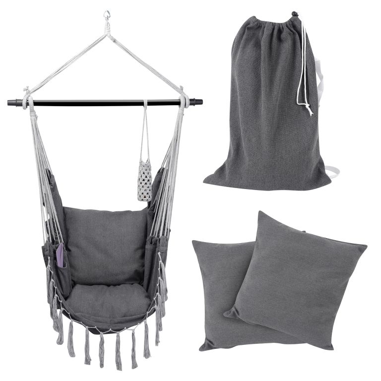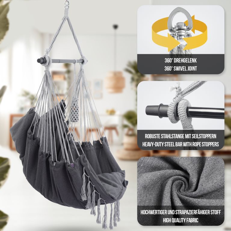 Toto visiace kreslo je vyrobené z odolnej zmesi bavlny a polyesteru a má odnímateľné poťahy na vankúše, ktoré je možné jednoducho vyprať v práčke. Údržba tohto visiaceho kresla je naozaj hračkou. Táto visiaca stolička je upevnená na oceľovej roztváracej tyči, vďaka 360° otočnému kĺbu si ľahko nájdete pohodlnú sedaciu pozíciu a užijete si maximálny komfort. Napriek svojmu pohodlnému dizajnu je toto visiace kreslo vyrobené z odolného materiálu, ktorý odoláva každodennému opotrebovaniu a poskytuje dlhú životnosť.