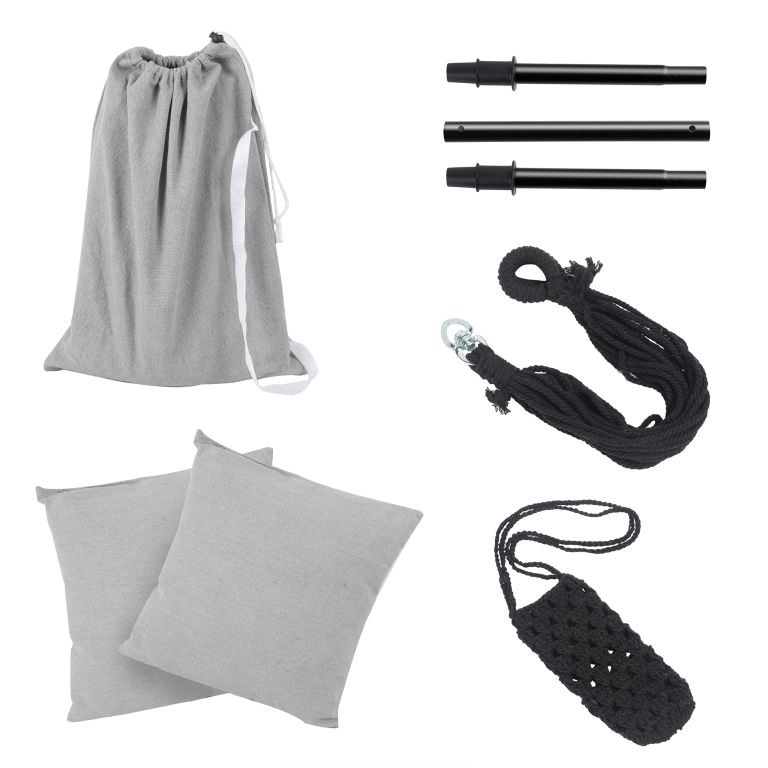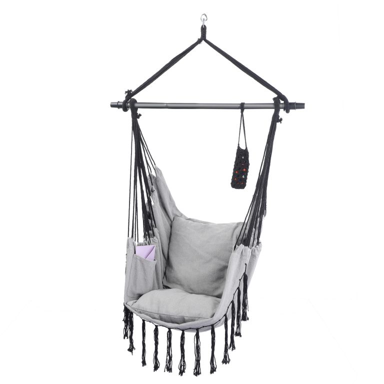 Toto visiace kreslo je vyrobené z odolnej zmesi bavlny a polyesteru a má odnímateľné poťahy na vankúše, ktoré je možné jednoducho vyprať v práčke. Údržba tohto visiaceho kresla je naozaj hračkou. Táto visiaca stolička je upevnená na oceľovej roztváracej tyči, vďaka 360° otočnému kĺbu si ľahko nájdete pohodlnú sedaciu pozíciu a užijete si maximálny komfort. Napriek svojmu pohodlnému dizajnu je toto visiace kreslo vyrobené z odolného materiálu, ktorý odoláva každodennému opotrebovaniu a poskytuje dlhú životnosť.