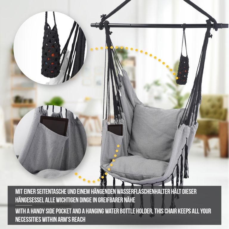 Láka Vás nebeský komfort a neuveriteľná relaxácia? Predstavujeme Vám naše závesné hojdacie kreslo, ktoré vás prenesie do sveta pohody. S odolným a príjemným textilným materiálom, oceľovou otváracou tyčou a bočným vreckom pre vaše drobnosti. Váhová kapacita 150 kg vám poskytne pocit bezstarostného ležania. Vychutnajte si chvíle odpočinku a ľahko sa otočte o 360°. Príjemný vankúš a praktický držiak na nápoje sú presne to, čo potrebujete. Skvelá voľba pre váš relaxačný raj. Nechajte sa uniesť a objednajte si toto úžasné hojdacie kreslo ešte dnes!